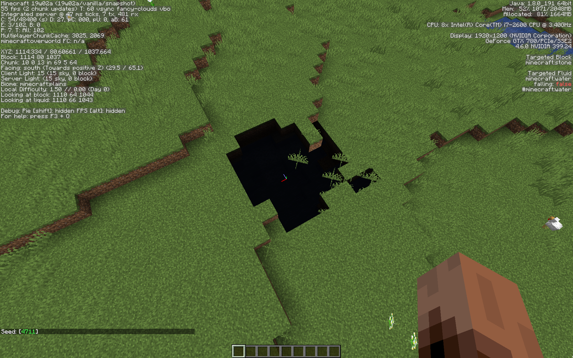 Starting with snapshot 19w02a, there are pitch black patches and dark spots quite commonly in the world, mostly in the plains biome. I haven't seen these in any other 1.14 snapshot that includes the new lighting system introduced in 18w43a.