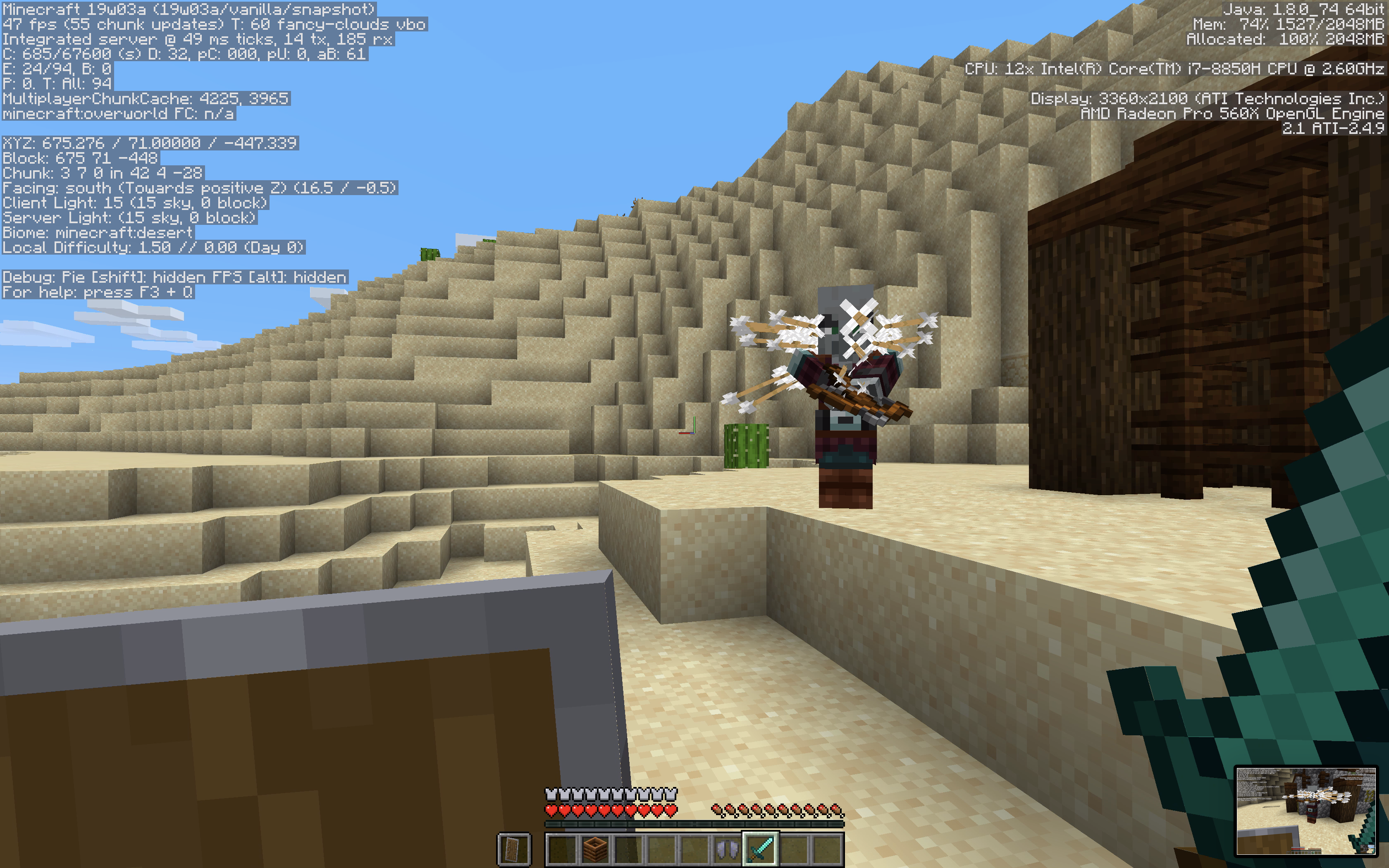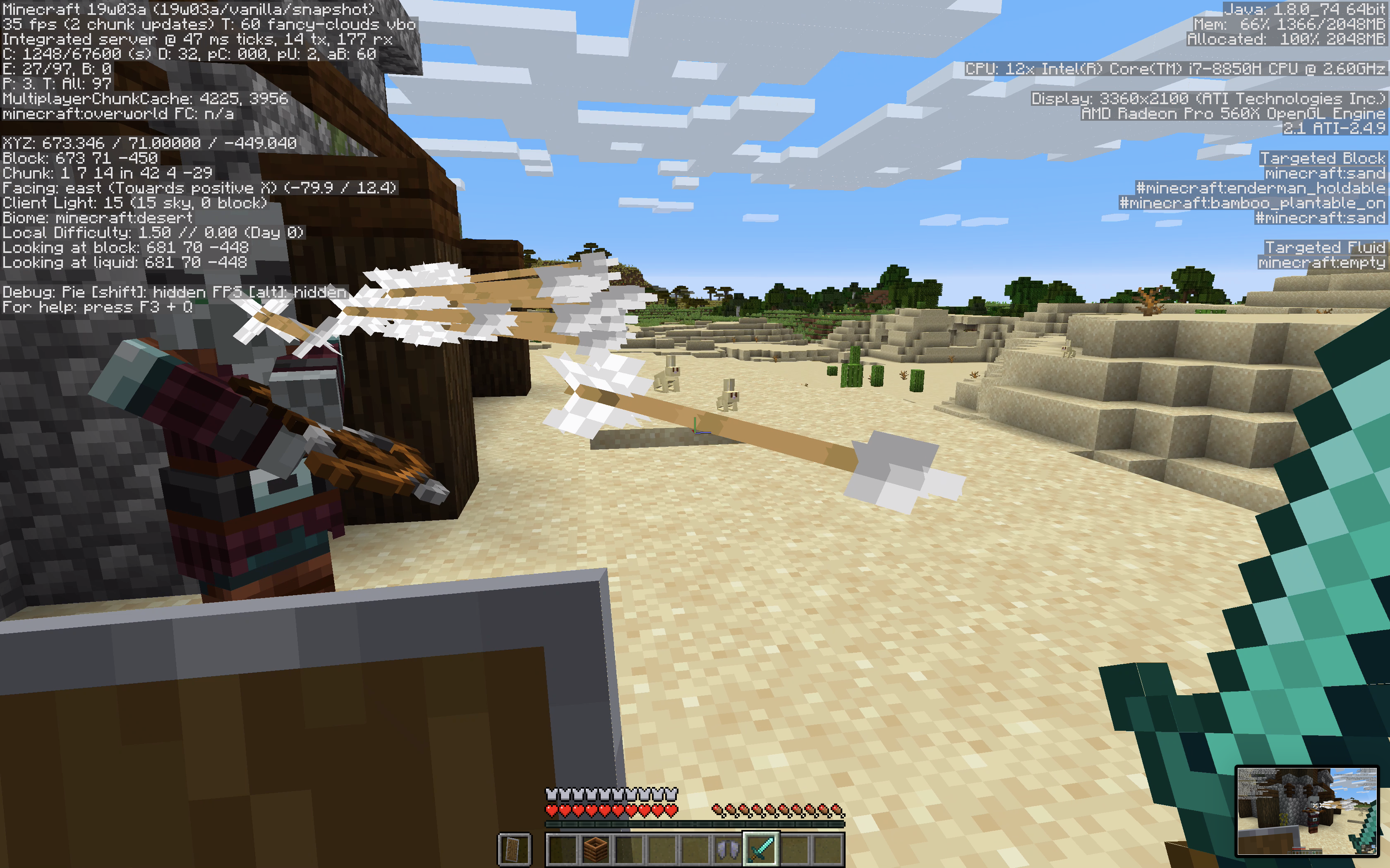Switched from creative to survival, wearing diamond armor, pillagers fire arrows with crossbow at player, but the arrows freeze during flight. I will take damage if I stand close enough to pillager.