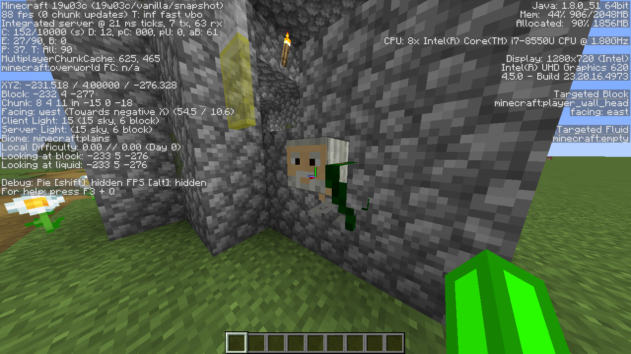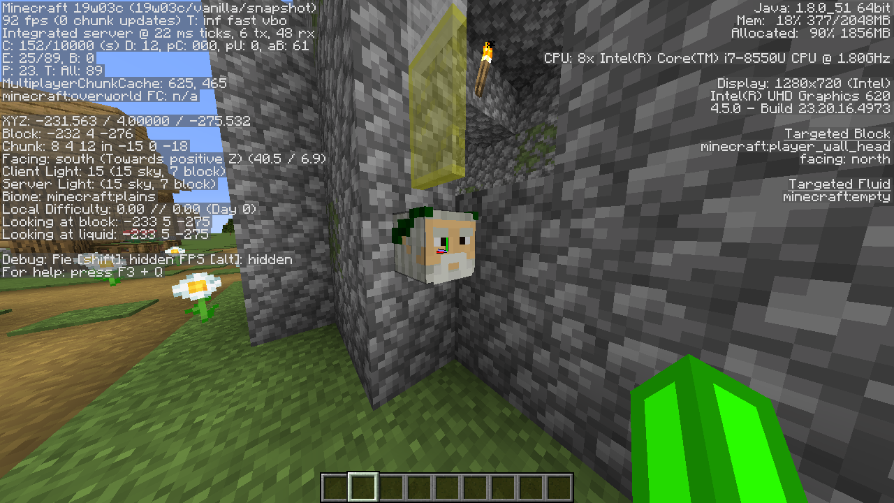 The "hat" layer of a placed(or woren by a player) player head is rendered strange. When placed it renders depending on the direction it faces. The head of a player(without a player head on his head) is rendering as usually.