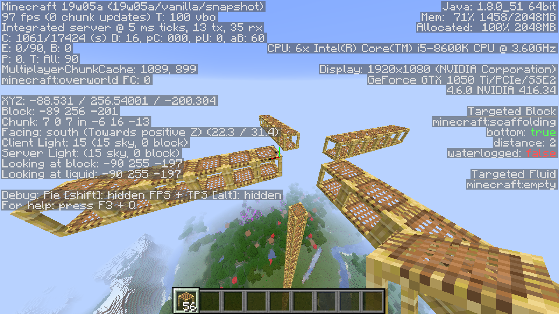 when I was playing around with scaffolding Istacked them up to y=256 which is maximum building height. then I placed them out to the sides to mak a little platform. When I finished playing around I wanted to break the platform and the scaffolding just stayed in the air and didn´t break.