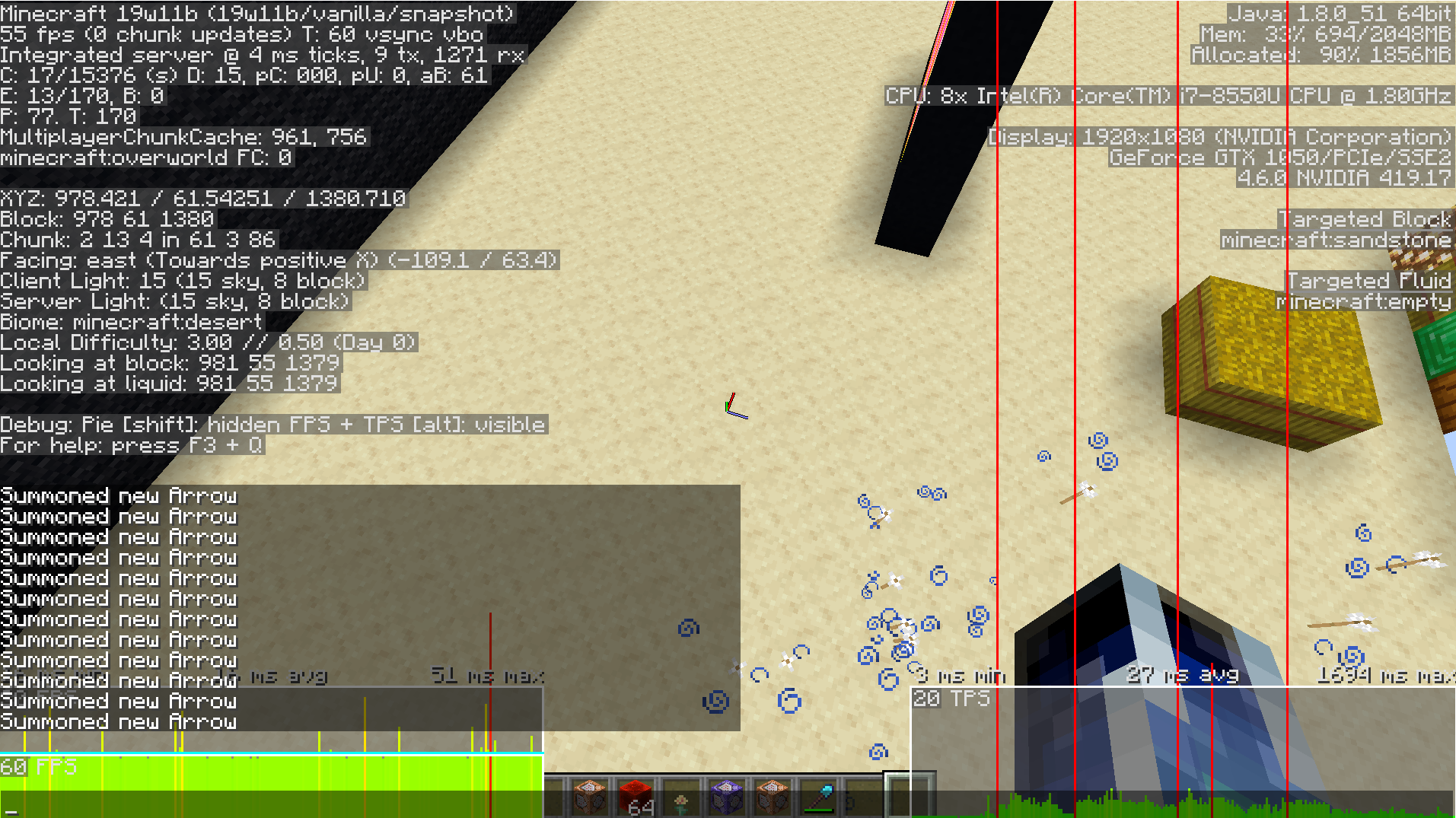 If the world spawn point is too far from (0,0), summoning an arrow or trident in the air causes the game to lag incredibly (to basically unplayable ticks per second) until the arrow or trident hits a block.