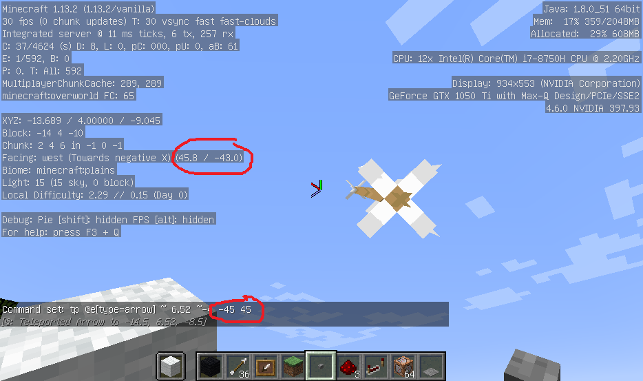 The procedures of the experiment are stated as following: summon an arrow; teleport the arrow using the command block having a input including rotational coordinates; move the player ultil the player approximately faces the same direction as the arrow.