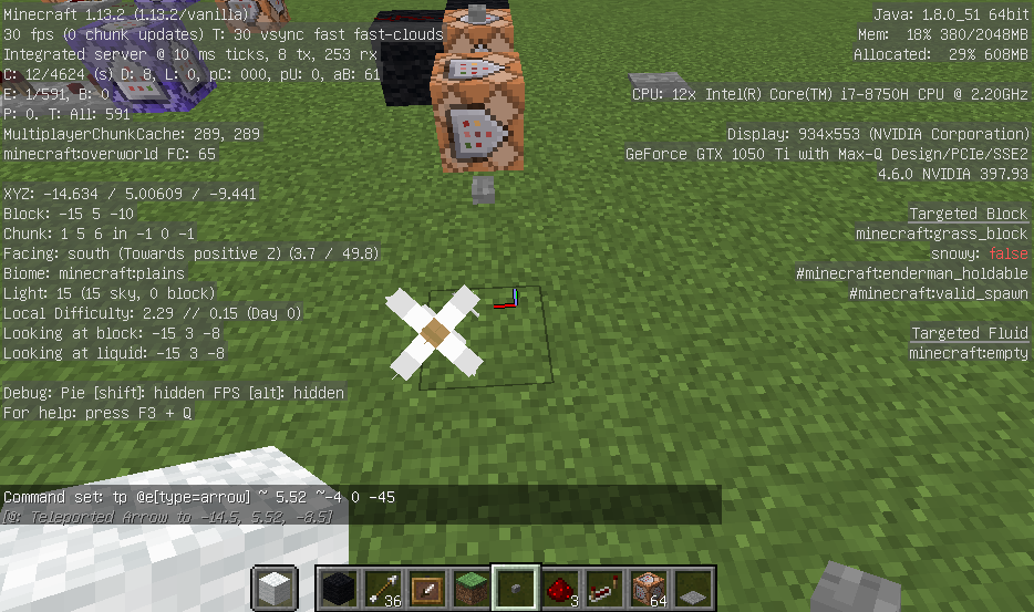 The attached four experimental screenshots will show how the arrow's rotational coordinates differ from the command block input as well as the rotational coordinates of the player.