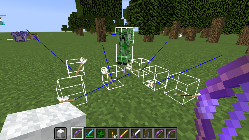 **As illustrated by the latest screenshot attachment, entity hitbox as well as a blue line indicating the direction the entity is facing are shown by pressing F3+B. The creeper has its facing correctly indicated by the blue line while the arrows have scattered wrong facing directions.