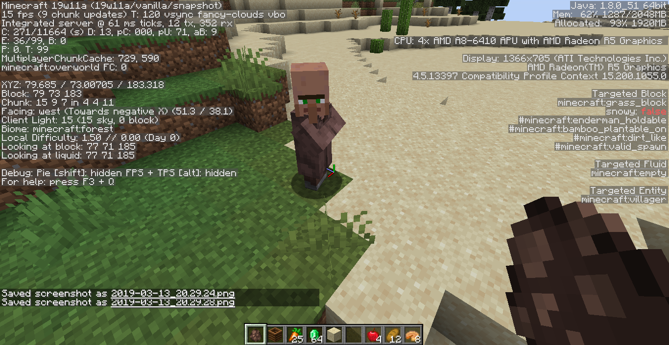 As shown below, I excitedly went to the nearest village to check mechanics. After being dissappointed that villagers spawned in composters won't become farmers until 3 mins later, I went over to the nearby forest biome to see if I spawned a villager there if it would join the desert village. I ended up with a brown coat.