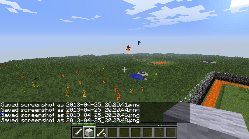 Advancing to morning (when using a bed) when it is dark enough for mobs to spawn will always result in various amounts of zombie "rain" in the morning. The zombies will spawn somewhere in the sky, fall to the ground, receiving no fall damage, and begin to burn. No other mobs have been seen "raining". Discovered in survival (not a fun surprise), and tested in creative. 'Hard' difficulty and 'Far' view range.
