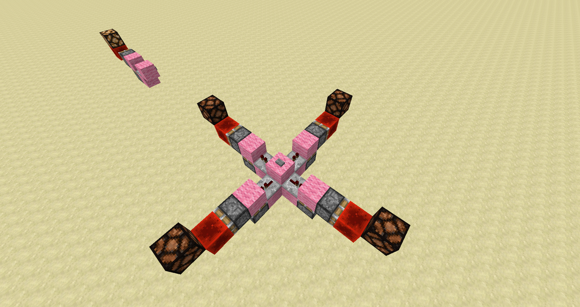 Upon making a circuit found on the third screenshot, I found that Sticky Pistons move differently when facing different directions. As can be seen, the circuit is a combination of four T-flip-flop circuits (on the first and second screenshot) and should make each Piston move simultaneously. However, as seen on the fourth screenshot, pressing the button in the middle didn’t make the Pistons facing North and South work. The Redstone circuits are identical, so it’s probably not a problem about the way I combined them.