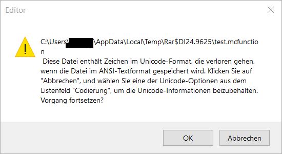 But when I start using Unicode in a .mcfunction file for a data pack/function for example in a /tellraw command it will show me an error Message (Picture 1 [In German]) because the ANSI format doesn't support Unicode. But when I save my .mcfunction file in the Unicode format or in the UTF-8 format the file stops working completely.