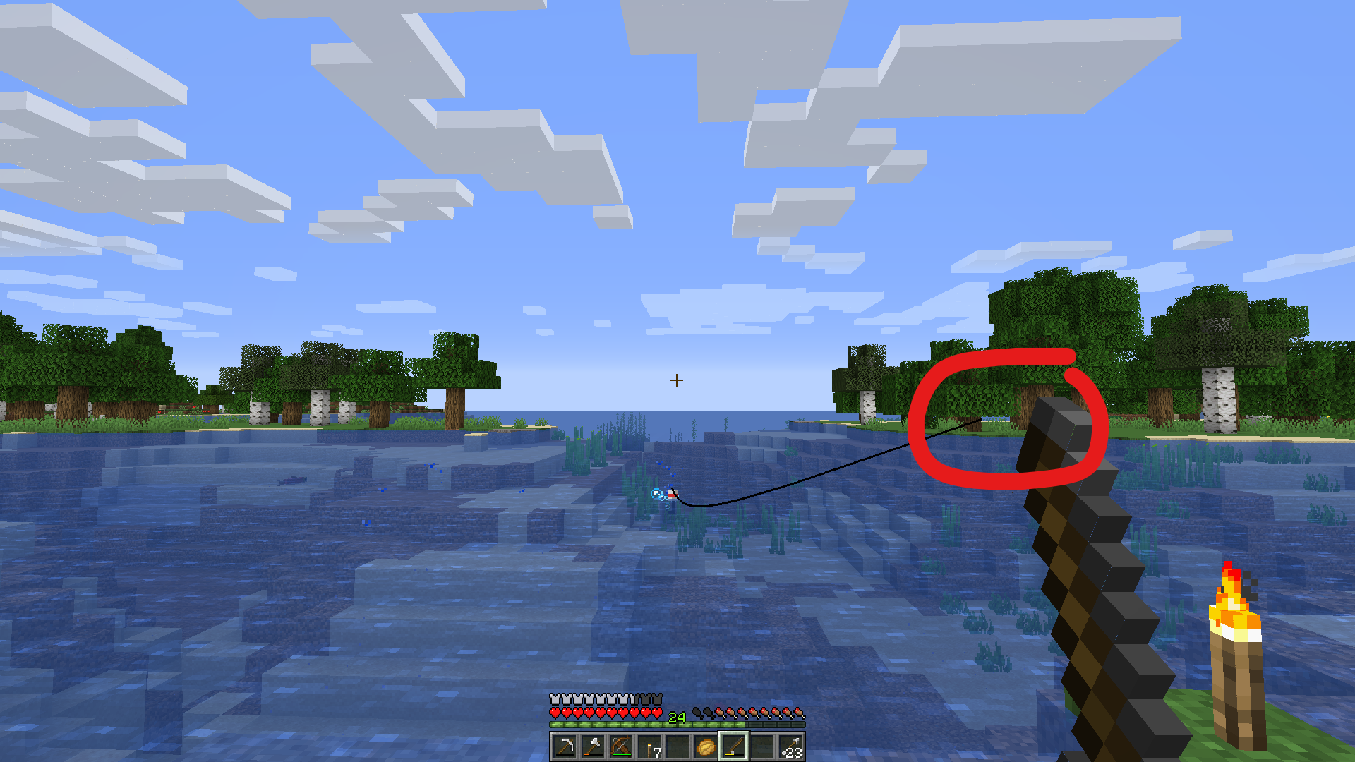 The fishing line is not connected to the fishing pole, there is a gap between the two.