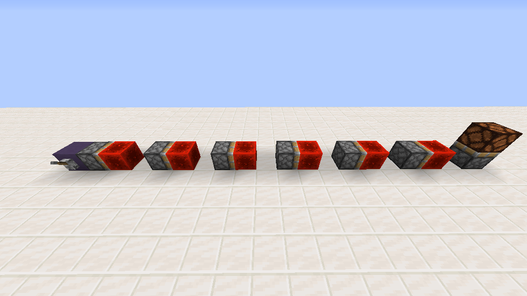 When placing the pistons and redstone blocks in the manner shown in the screenshot, activating "piston 1" will activate "piston 2", then from 2 to 3, 3 to 4 ... more when the first piston is deactivated, all the pistons are deactivated simultaneously, causing a slight decrease in fps for a few moments.