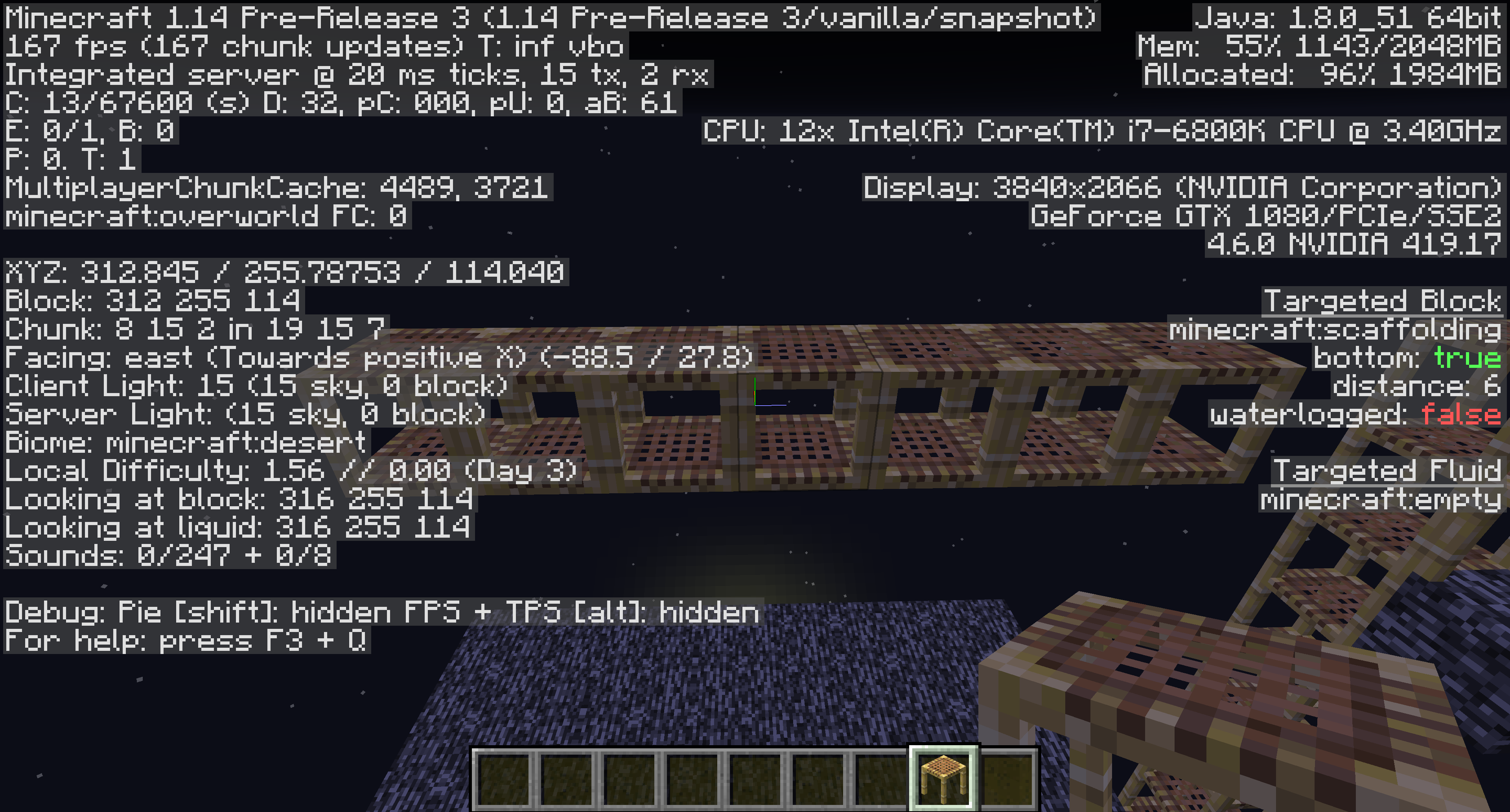 I was playing around in a completly new desert flatworld i built up with scaffolding blocks to the max built height y-256, if you right-click the top block it should add a block to the directing you're looking. This will work to it can no longer support itself so the block just falls straight off the edge, but this isnt the case. At the block where it should fall it actually placed a block and you can't continuue on any longer in the direction. If you then go back to the start and rightclick the first block that hangs of the scaffolding tower and right-click the block the block disapears and gets added to the end and it's flying in the air with no support blocks you can also just break the first or any block and it will still stand. You can keep right-clicking the block infinitely and also change directions. If you try to break the blocks in survival they do not drop this is the same if you blow them up with a tnt they still do not drop. This does not occur at y levels below 256 or 255 where the block is scaffold block is located shown in the screenshots. They also seem to disapear if i leave and rejoin the world.