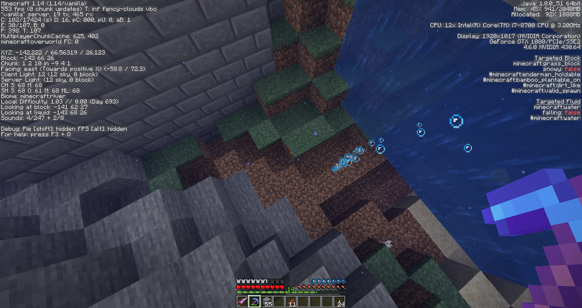 Monster Mobs spawned (as expected) under the platform, but as water fell after breaking the platform, they behaved as if they were on land (water slowness in affect) and not drowning nor catching fire in the daylight. The zombie shown in the screenshot eventually turned to a Drowned and swam to the surface to attack.