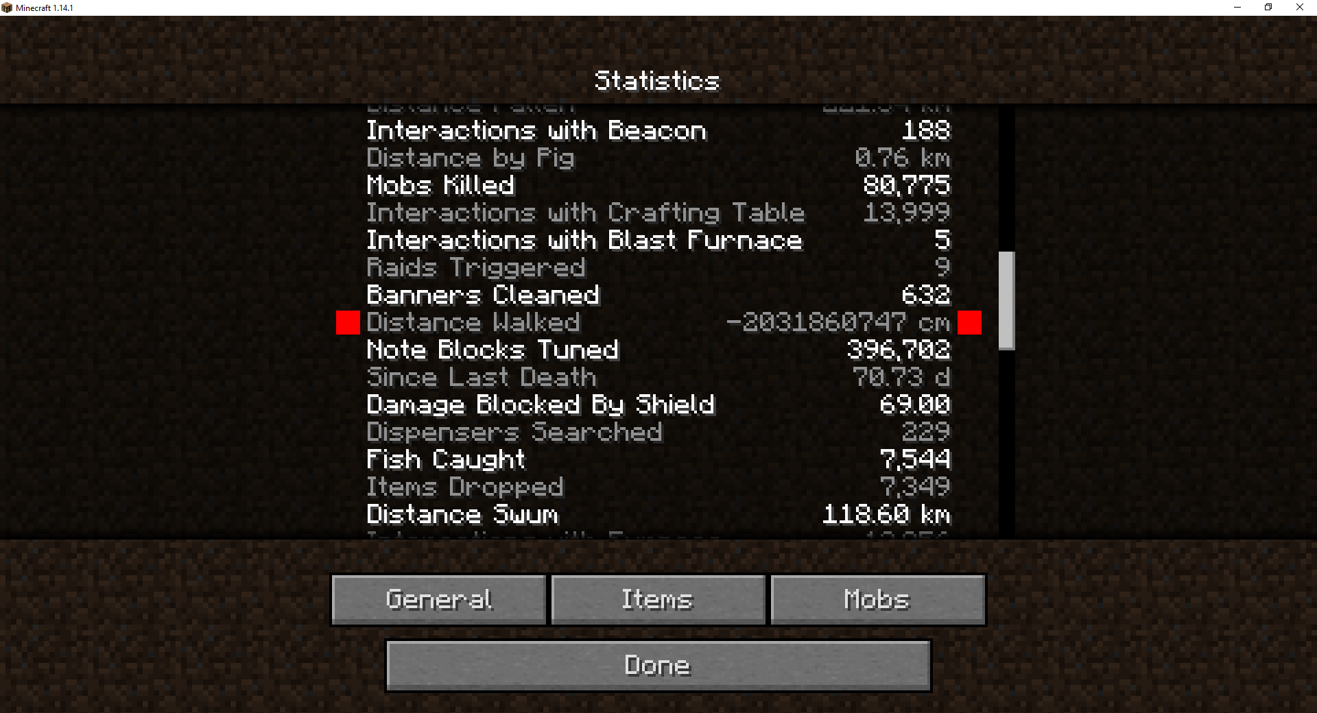 If the player walks more than 21,474.83647 kilometres, the display overflows the 32-bit integer limit on conversion and is displayed as a negative distance in centimetres.