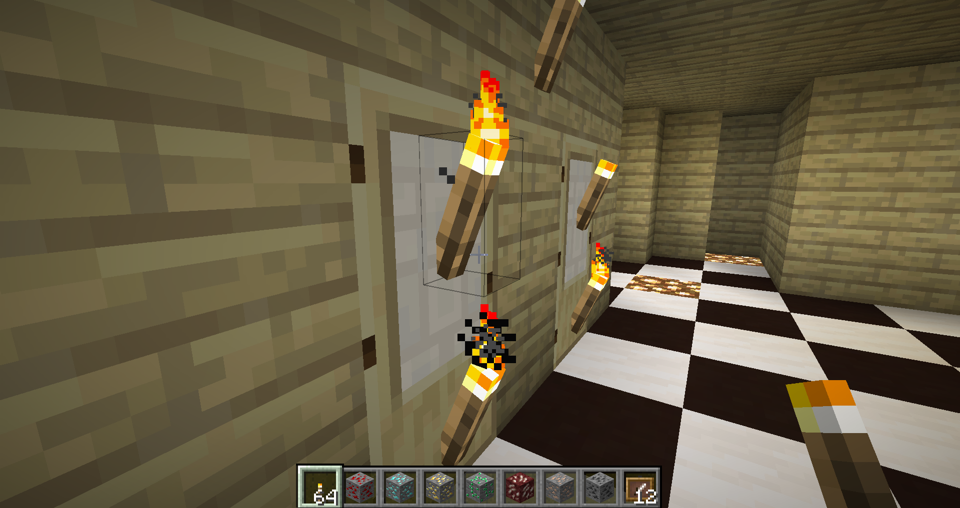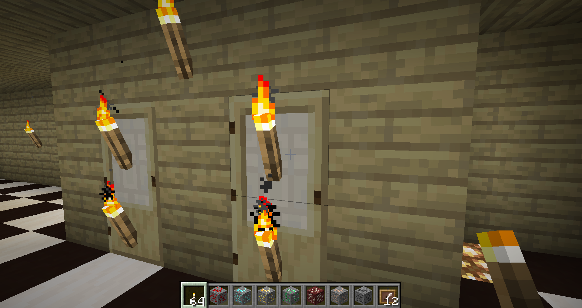 Place a door then sneak and place a torch while looking at the door. The torch will go on the door then if u open the door the torch will break