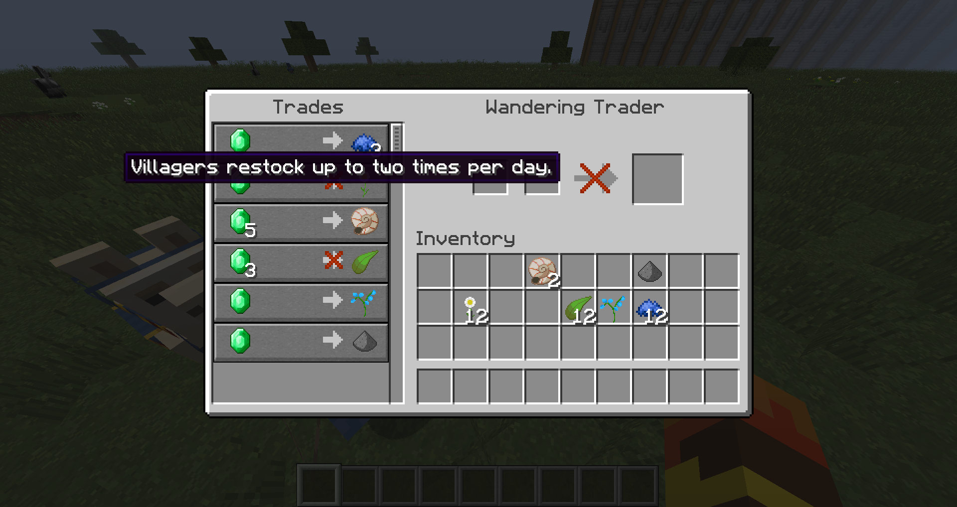 When you trade with a wandering trader, and it locks one of its trades, when you hover over the X over the arrow in the trading interface, the message "Villagers restock up to two times per day" appears. However as a wandering trader's trades cannot be restocked, this is inaccurate.