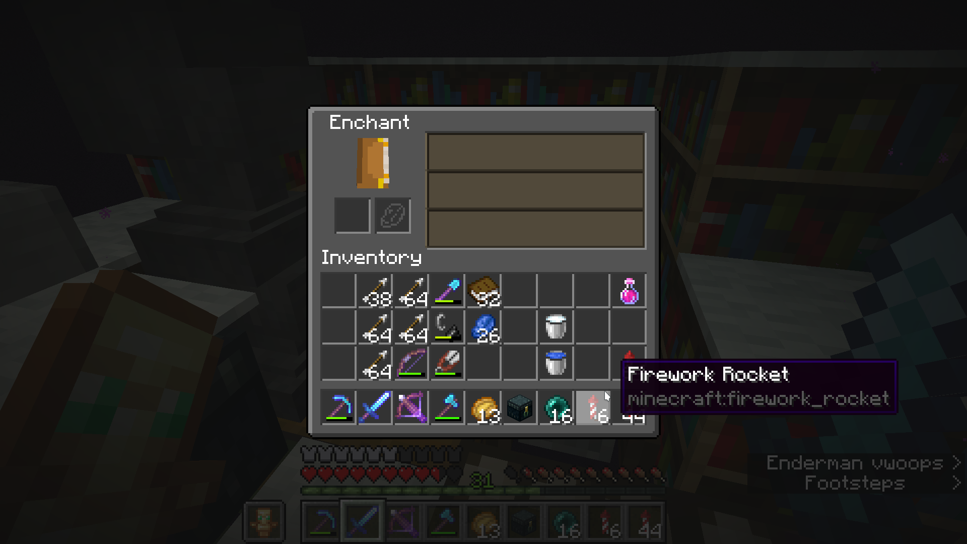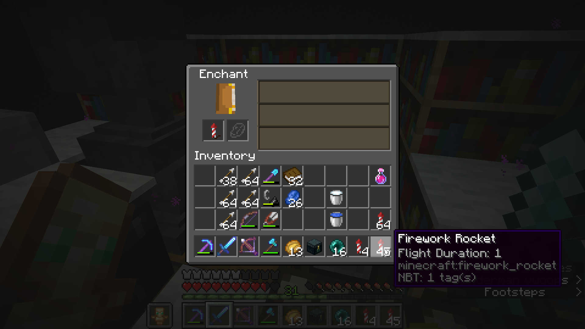 Fireworks lose their duration message if player put them in enchanting table while holding shift and they wont stack with other fireworks