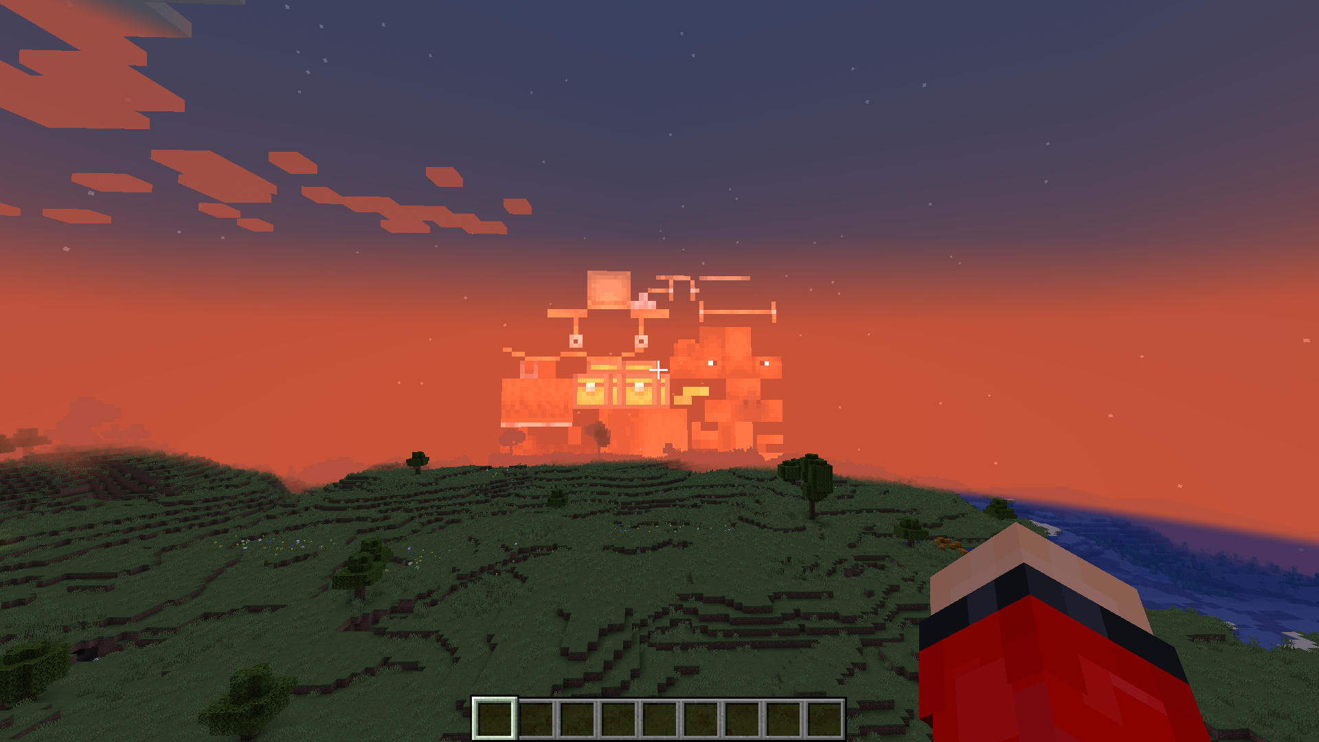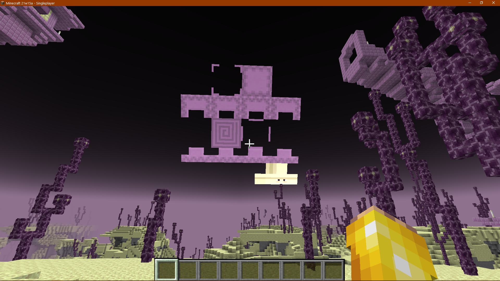 The moon was going down, and I looked at the rising sun. It looked like a skin file, and it was the texture file for a pillager. I did not have any texture packs, mods, shaders, or any such things loaded. It was vanilla Minecraft. In a different world the sun looked like a map. It might have something to do with the fact that I was in a raid, when the sun looked like a pillager. Also When the sun looked like a map the map looked like the sun. The pillagers were also solid black, though the crossbows showed up. When I pressed F3+T to reload resource packs it went back to normal.