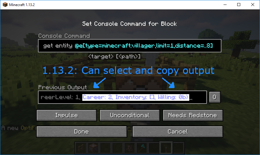 /data get entity @e[type=minecraft:villager,limit=1,distance=..8]/data get entity @e[type=minecraft:villager,limit=1,distance=..8]Put a lever next to the command block, and pull the lever