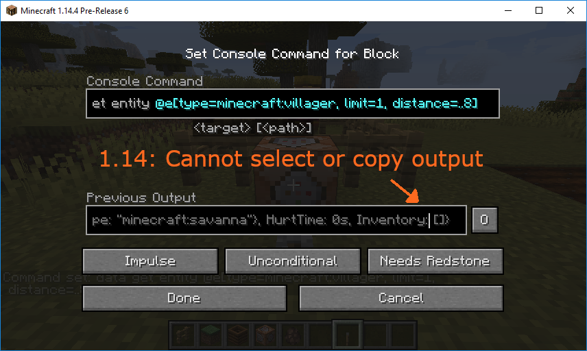 It might be a dupe of that bug report, I'm glad it's not just me who noticed this bug! But it still happens in 20w09a, so I assume it's the same for both bug reports. Wonder if it's due to a recent (or past) LWJGL update? Except I can copy/paste the command block input - I should also be able to copy the command block output too. Argh. I'll upvote 147649, hopefully that'll give this bug more visibility. Thanks for the info, Frostyflyrap!