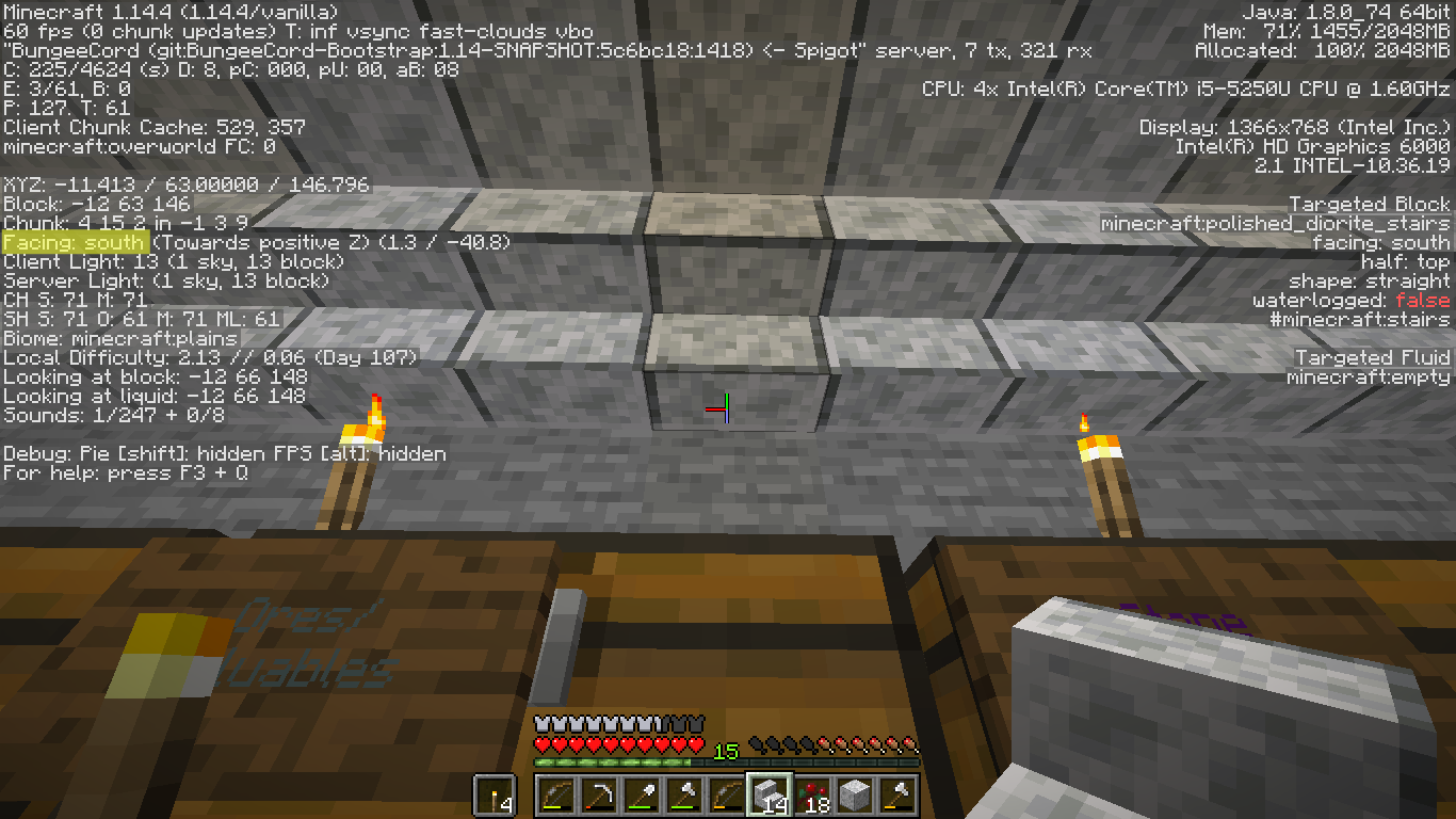 When smooth diorite stairs are placed up side down such that the flat side faces south or east a texture error occurs such that the the darker line at the edge of the stair block switches sides between the panels of the stairs that are facing horizontally or vertically (upper left and bottom right image display the error)