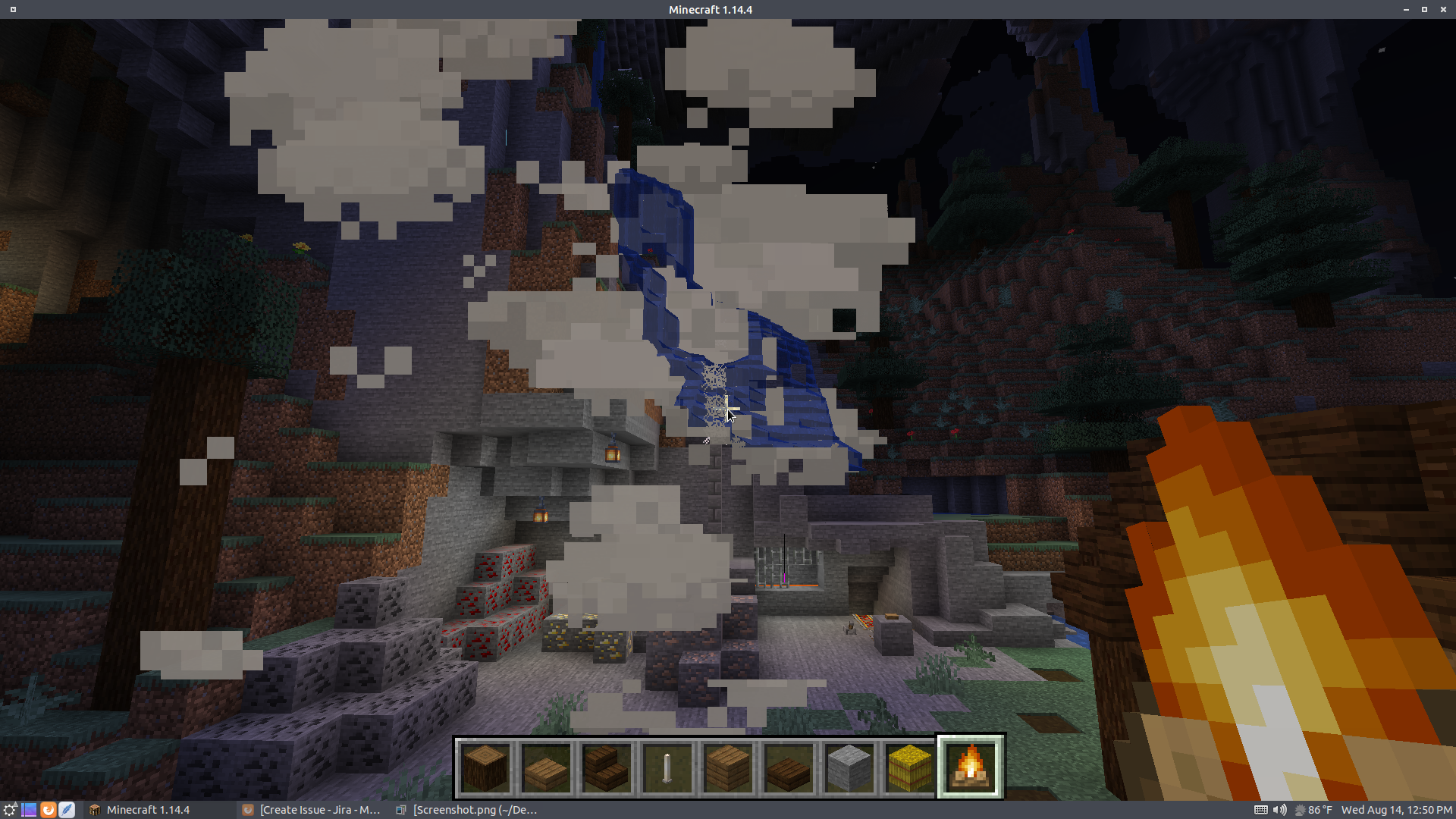 While looking at the campfire smoke behind a body of water, the smoke does not cover the water as it does with the surrounding objects. This creates a weird overlay making it seem that the smoke is behind the water. I tired this with lava also but the graphics error did not happen. In fact the lava registered as the water should, not being able to see through the smoke. As far as I can tell, you can set up the campfire and look through the smoke at any body of water with the same outcome(graphics glitch). This isn't a high priority, it's just mildly irritating.