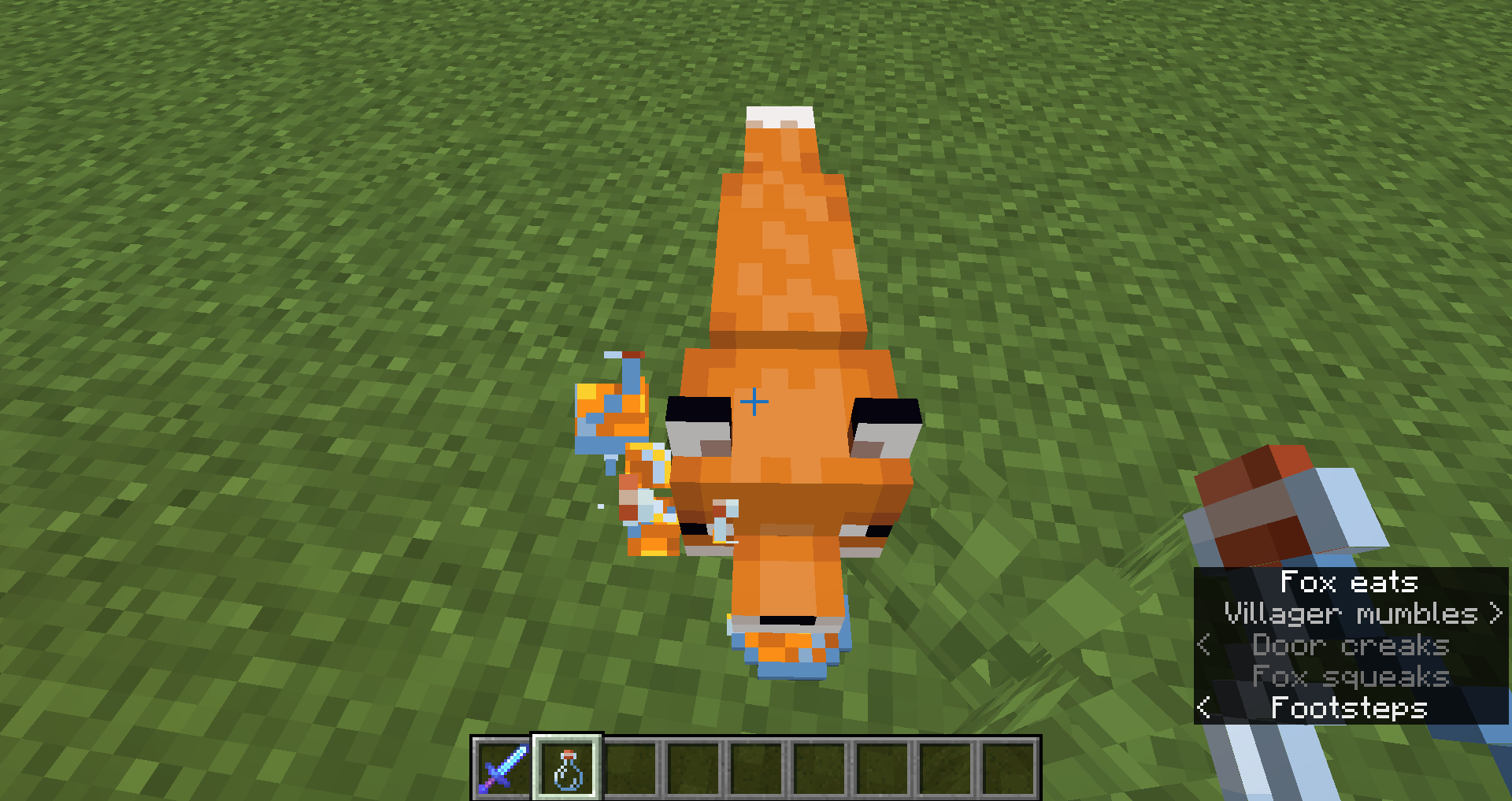 /summon minecraft:fox ~ ~ ~ {equipment:{mainhand:{id:"minecraft:honey_bottle",Count:1b}}}/summon minecraft:fox ~ ~ ~ {equipment:{mainhand:{id:"minecraft:honey_bottle",Count:1b}}}Wait for the fox to eat the honey.