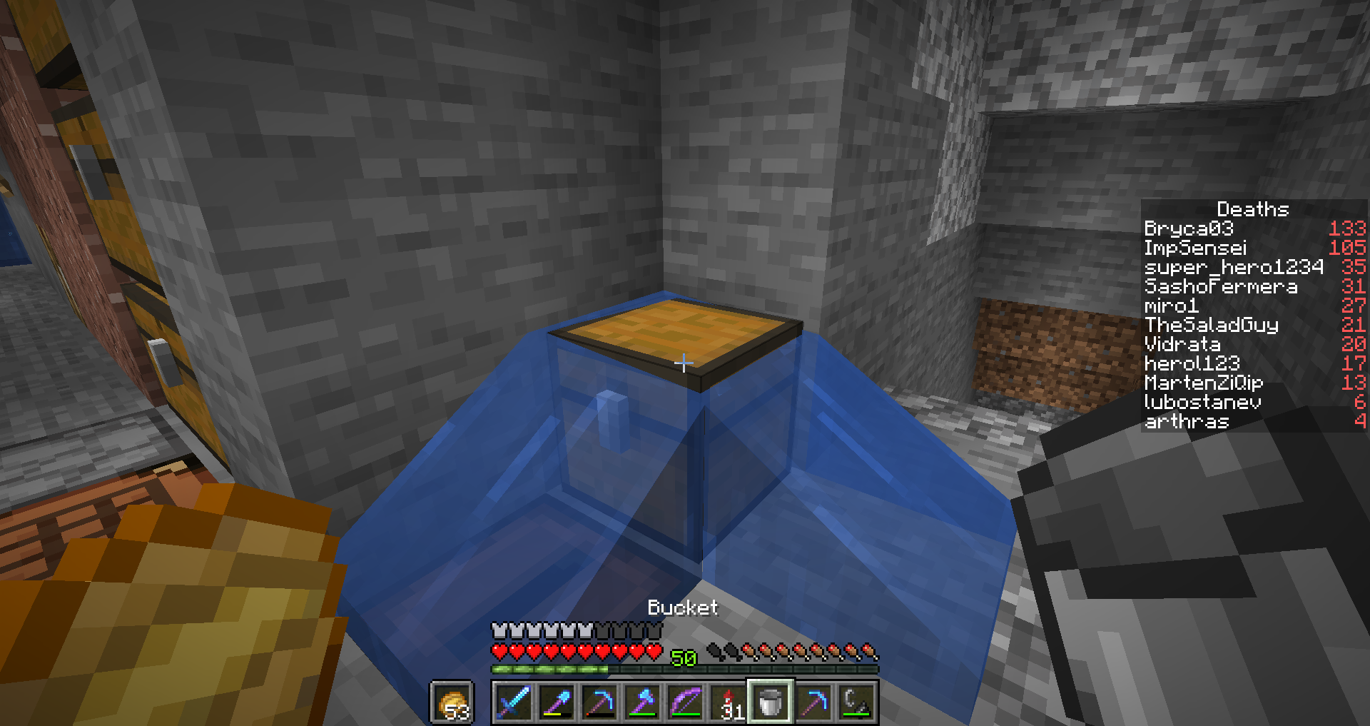 It's a rather hilarious bug, but I can place water sources inside the following: Chests, Ender chests, Trapped chests, Double chests, Fences, Slabs, Stairs, Scaffolding, Trapdoors, Ladders, Walls, Signs, Campfire, End Crystals. Lava does not have the same issue. Tested on both version 1.14.4 and snapshot 19w36a in Singleplayer and Multiplayer. Attached pictures are from Multiplayer.