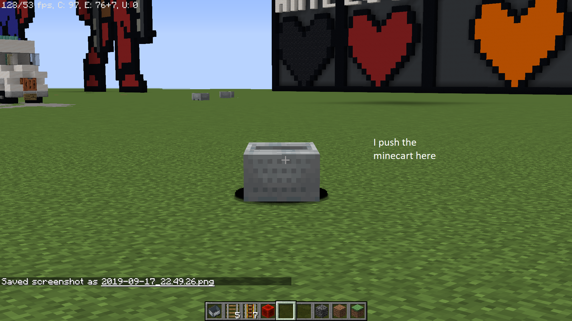 3. Repeatedly place minecarts on the side of the rail (30 - 50) until a dark shadow appears underneath the rails.