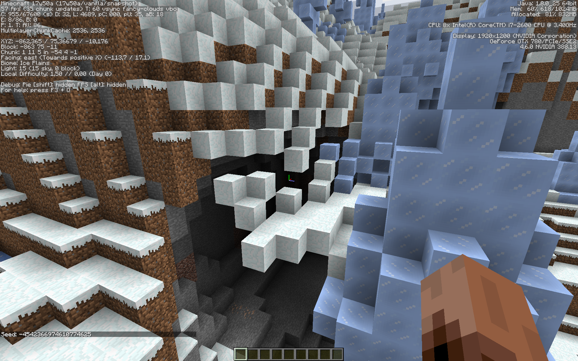 Also disagree with resolution. This mountain cave looks like a giant parkour course inside, floating and isolated snow blocks EVERYWHERE. And all the cave entrances are either completely covered in snow or covered with just enough to make it a chore to get through them. Aren't cave entrances supposed to be... entrances? I'm pretty sure if cave entrances in the plains biome were blocked by a thin layer of grass, that would be considered a bug. Why is this not? It's also worth noting that grass blocks are able to spawn inside caves, but AREN'T found floating in midair inside them. Surely the same would apply to snow blocks. This hardly seems intentional, this looks like an oversight at best or laziness at worst.