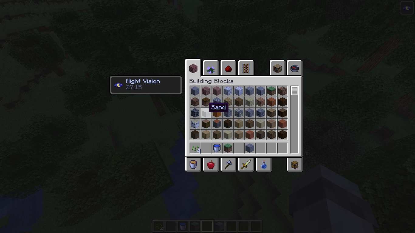 When the player has night vision effect, it changes the color scheme of some menus as they appear more orange and gives the blocks in the inventory a more bluish tone.