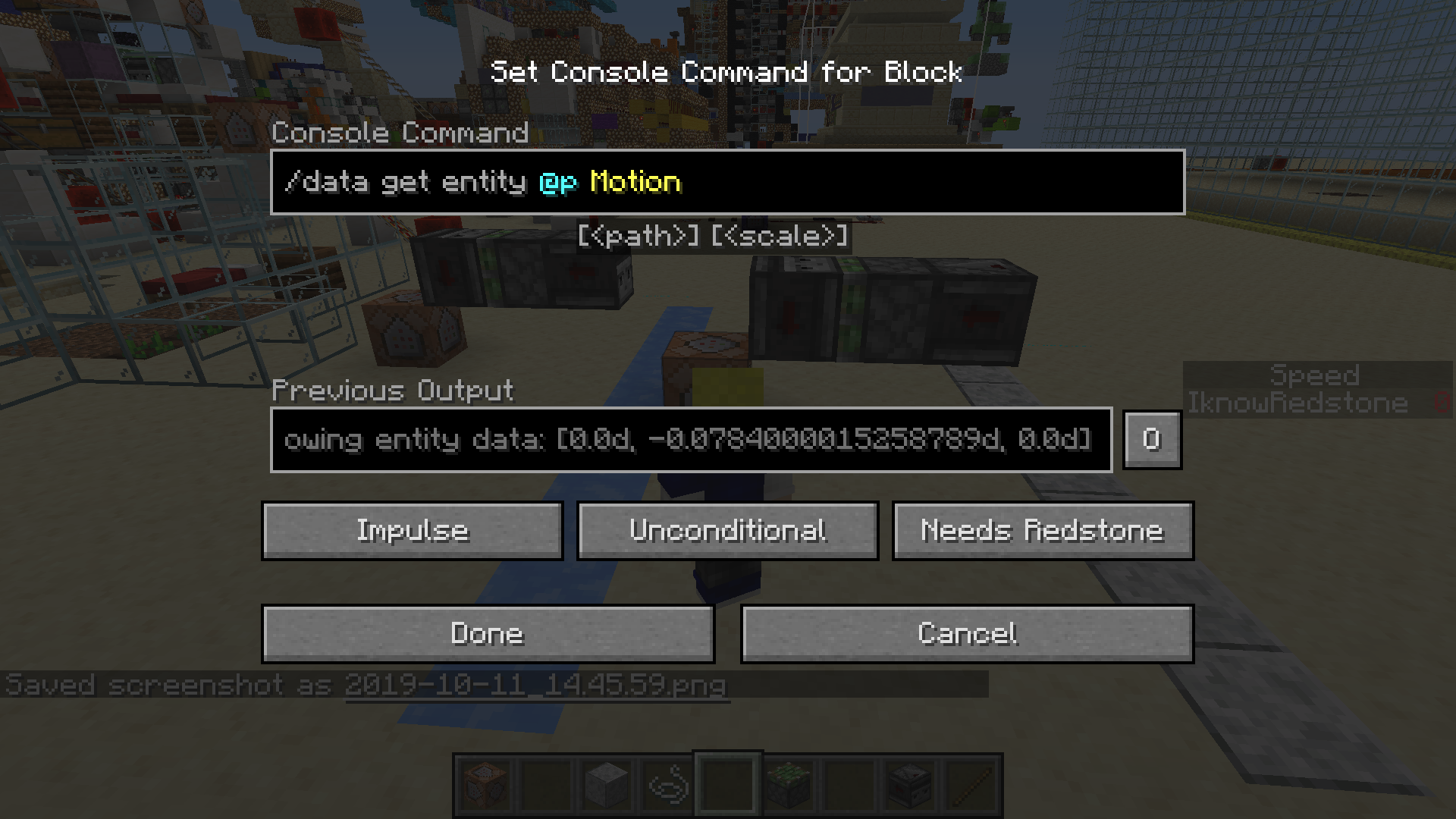 both command blocks contain the command: /data get entity @p Motion