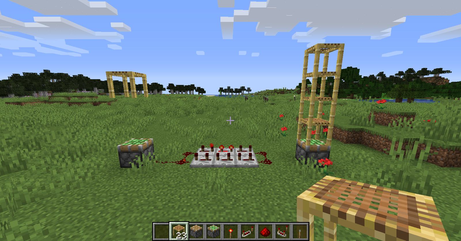 and place any moveable block on-top of it.When the sticky piston is unpowered, place a scaffolding block. (Although, highly suggest placing more as it increases the number of ticks before all the scaffolding blocks are broken.)
