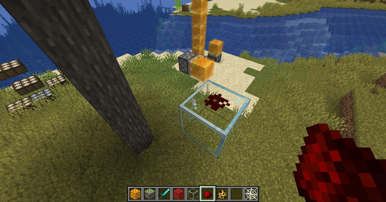 put glass and a redstone dust above and look the glass under you are going to see that the redstone dissapears