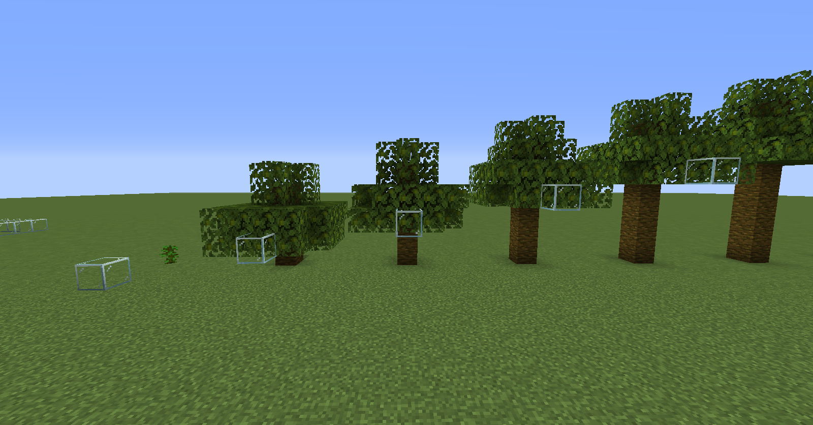 Birch, jungle and oak trees need a 7x7 area of air centered around all the logs that do not have leaves. For example: If a tree wants to grow 6 blocks high, 3 of which are surrounded by leaves, it would need a 7x7x3 area centered on the sapling for it to grow. See the attached screenshot for a visual representation. This means that if there is some grass within a 7x7 area of the sapling it never grows, which is quite annoying. This also breaks most tree farms, since they have a 5x5 chamber. This doesn't apply to acacia, spruce, large oak, large spruce, large jungle and dark oak trees.