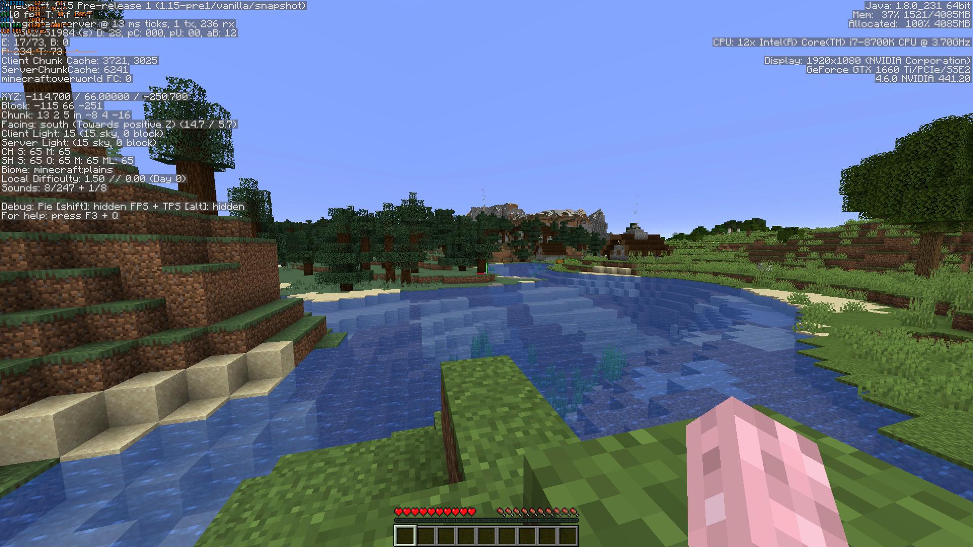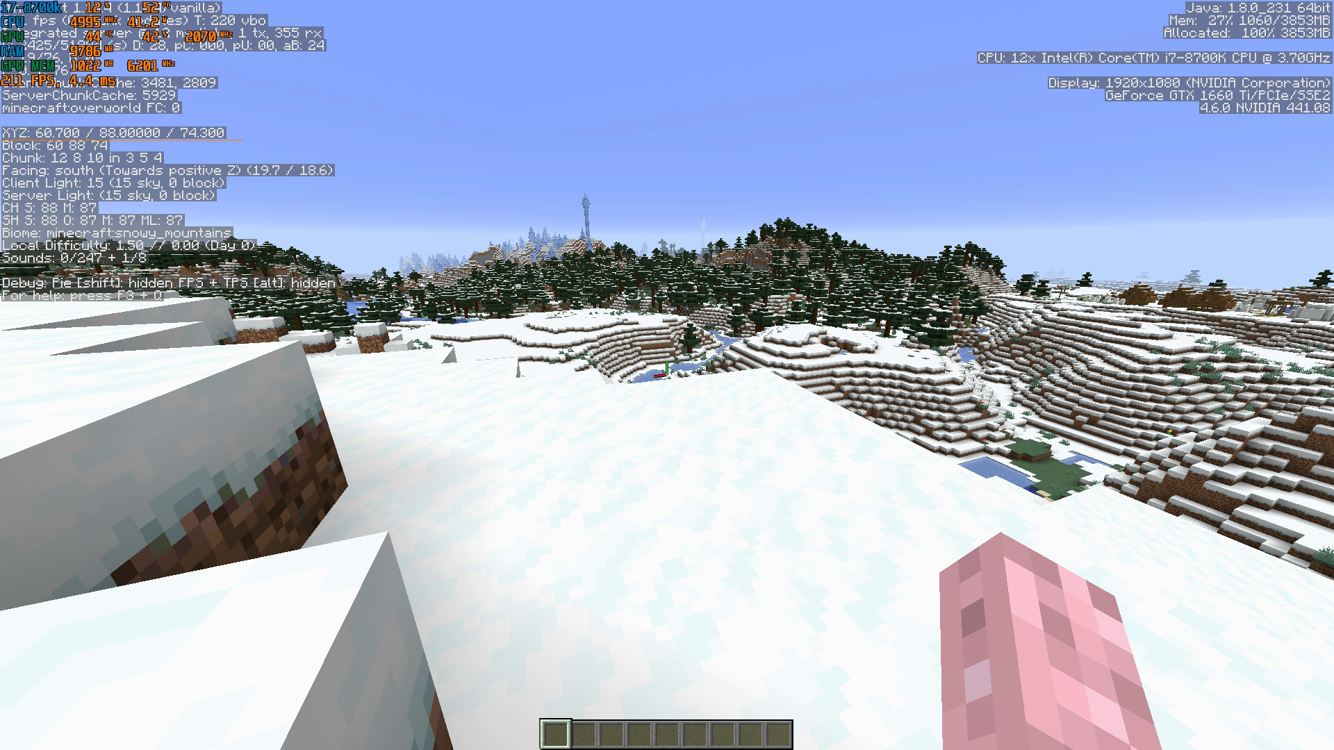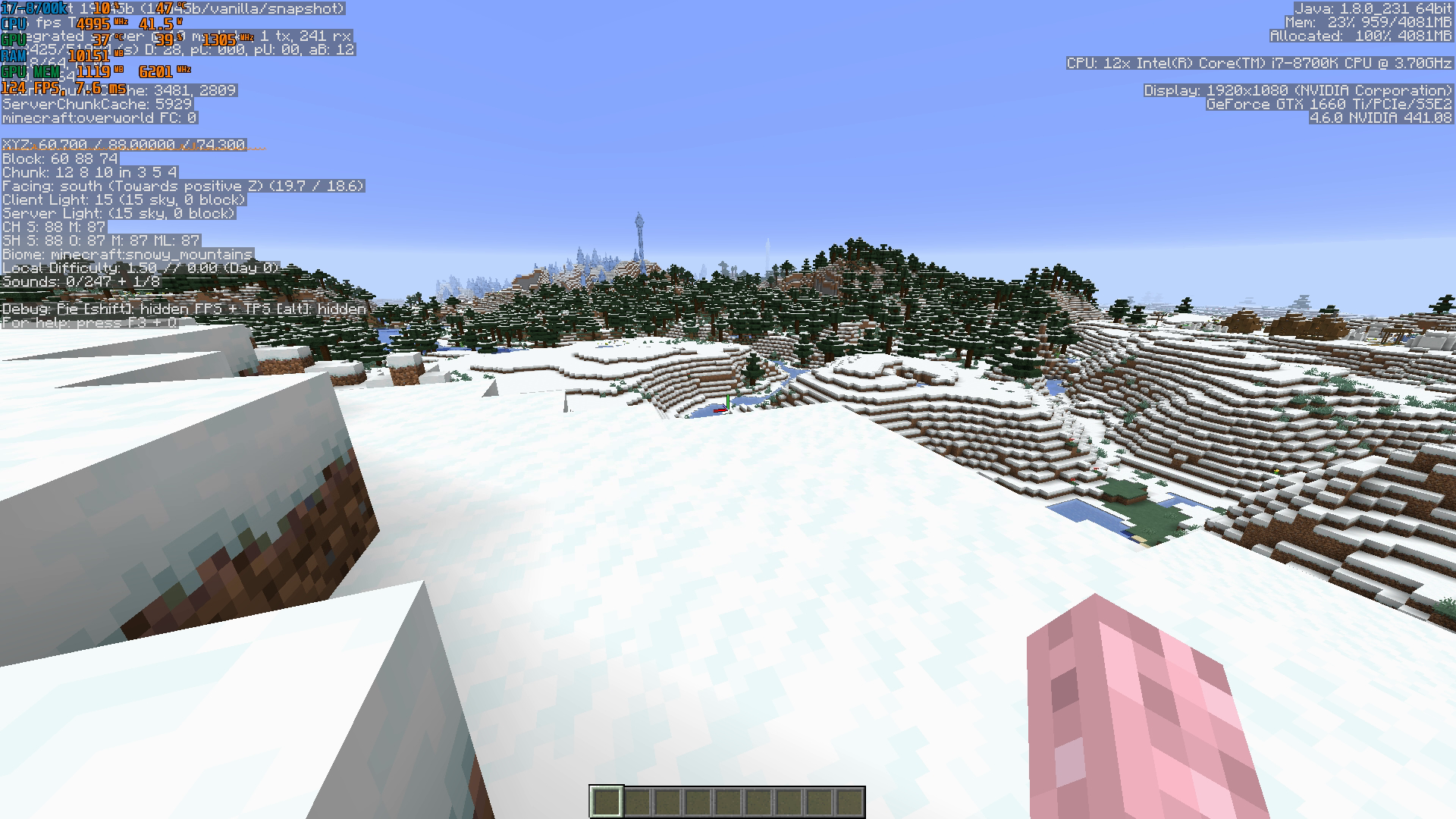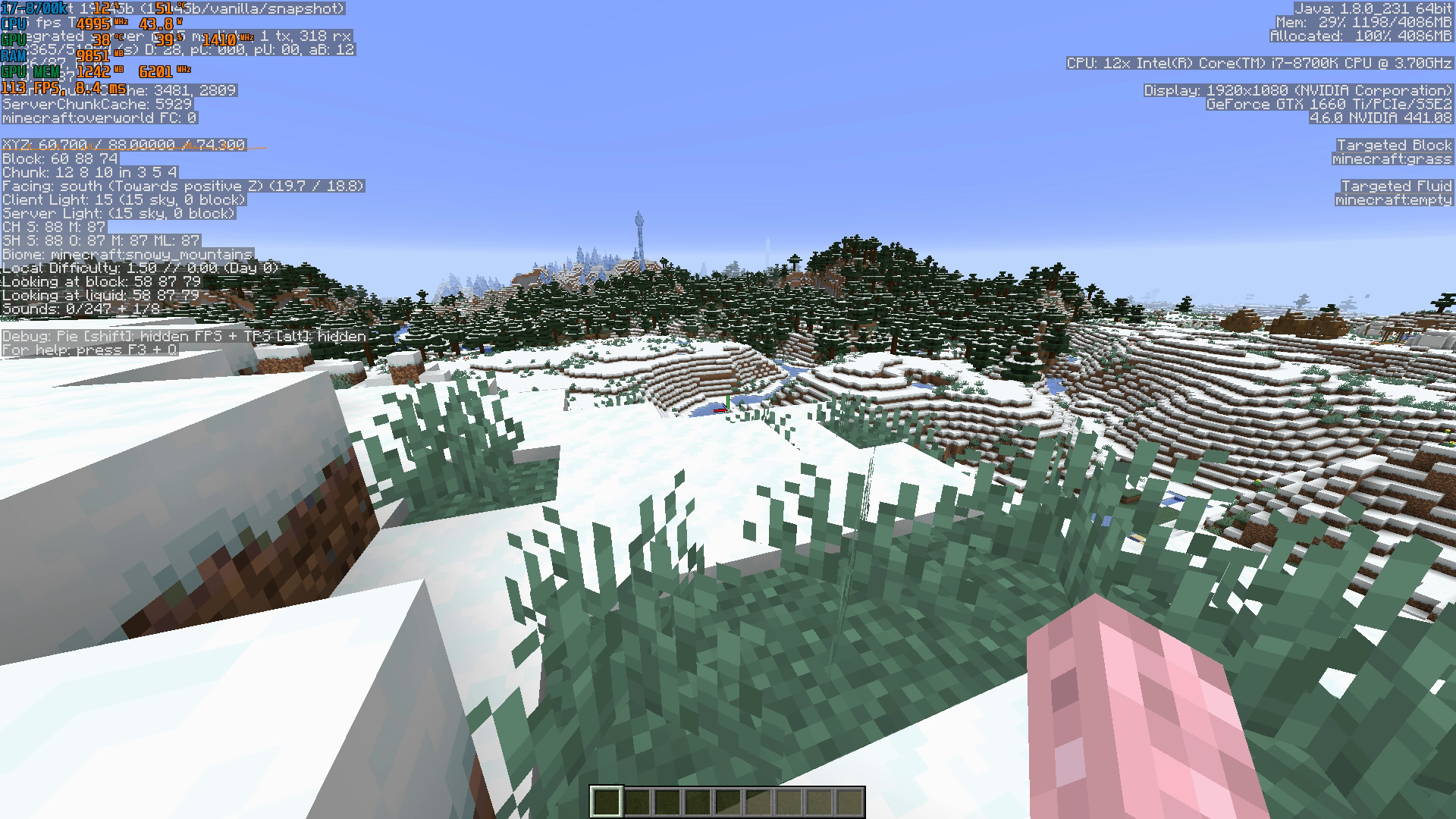 -then 1.15-pre1 with no tweaks or shenanigans, reusing the world from 1.14.4 due to the bugfixing of world generation resulting in different visuals in some places, want a 100% correlated test here within reason (villagers or mobs popping in sight). About 110FPS, 38%GPU utilization at 1395Mhz (which is 2D-mode clocks)
