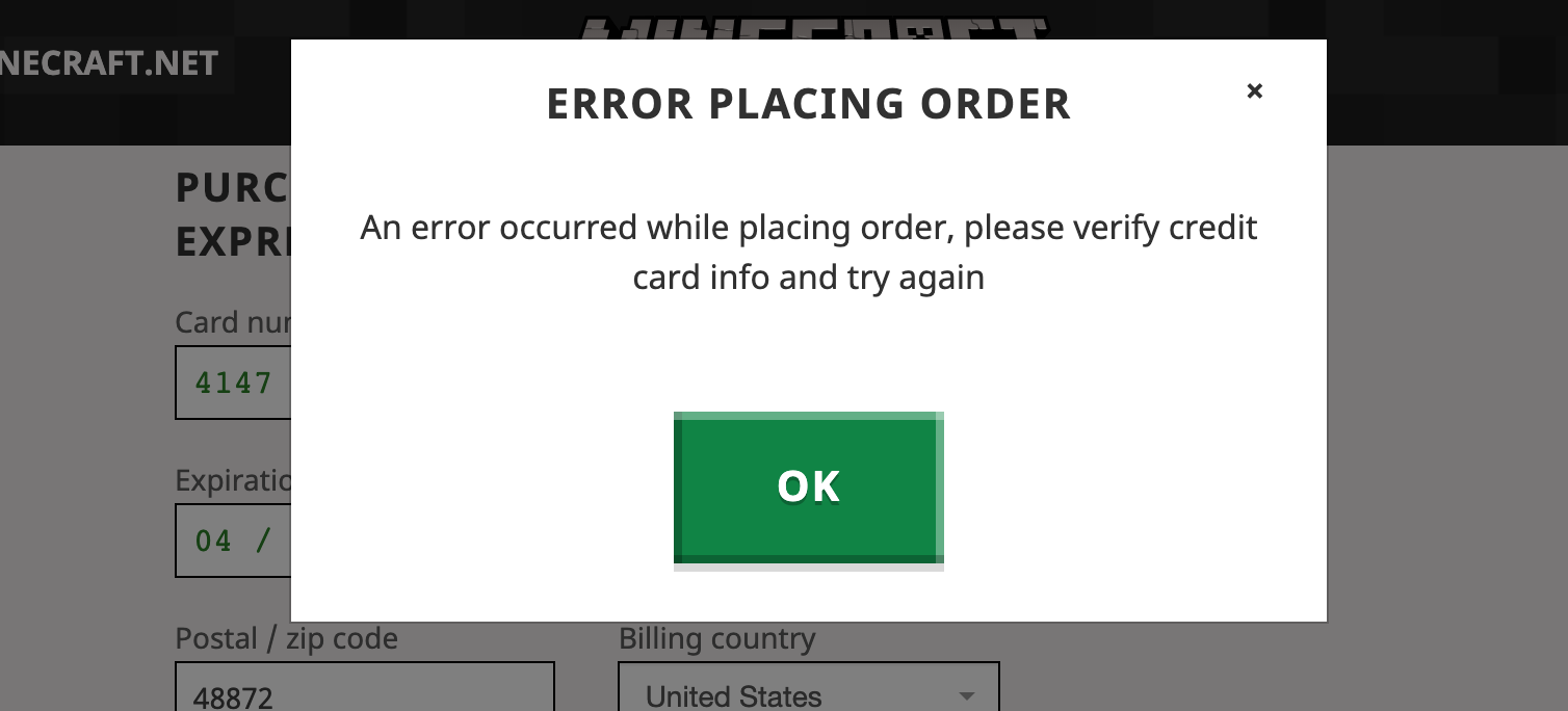 Every time I try to buy Minecraft, I get a notice that says "ERROR PLACING ORDER: An error occurred while placing order, please verify credit card info and try again." I've tried different browsers, different payment methods, and nothing works. Please help me get this done.
