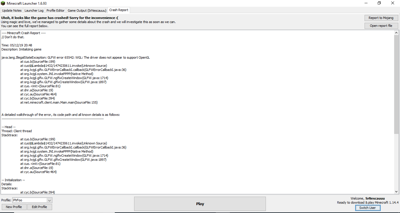 firstly I open the launcher and click to play, when I click to play many writings appear, and one of them says Open gl: in context, which say that is the Open GL bug please help me, I'm from Brazil and I paid dearly in Minecraft.