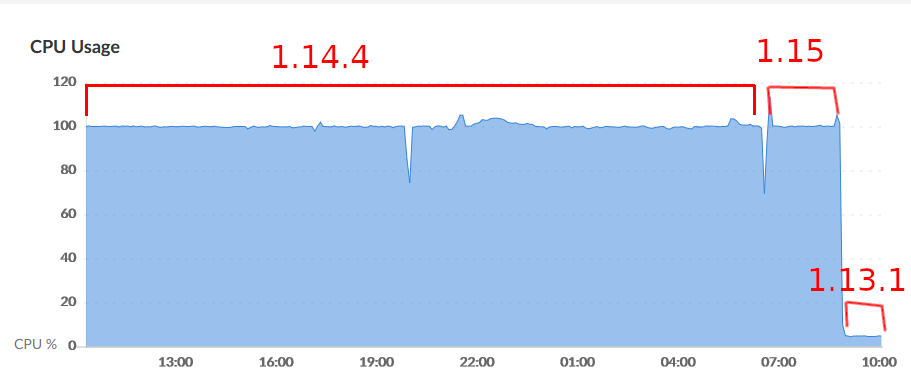 I ran a test by switching my server from 1.14 to 1.15, then 1.13 to show the relative differences in performance. Attached is the CPU usage chart from the Linode instance I use to run the server. The sections labeled 1.15 and 1.13 are brand new worlds with no players logged in.