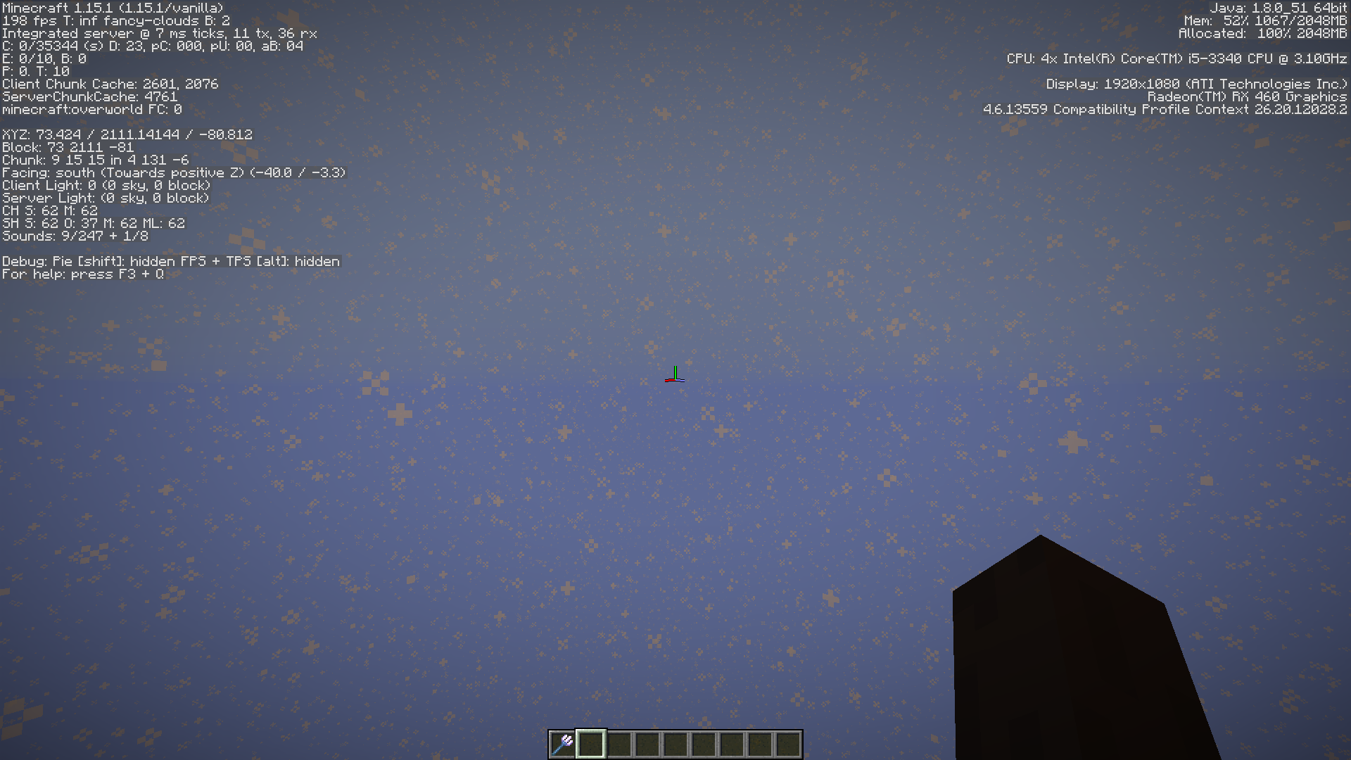 Go to some coordinates very high above ground (Doesn't always work) and your hands and items in them turn black.