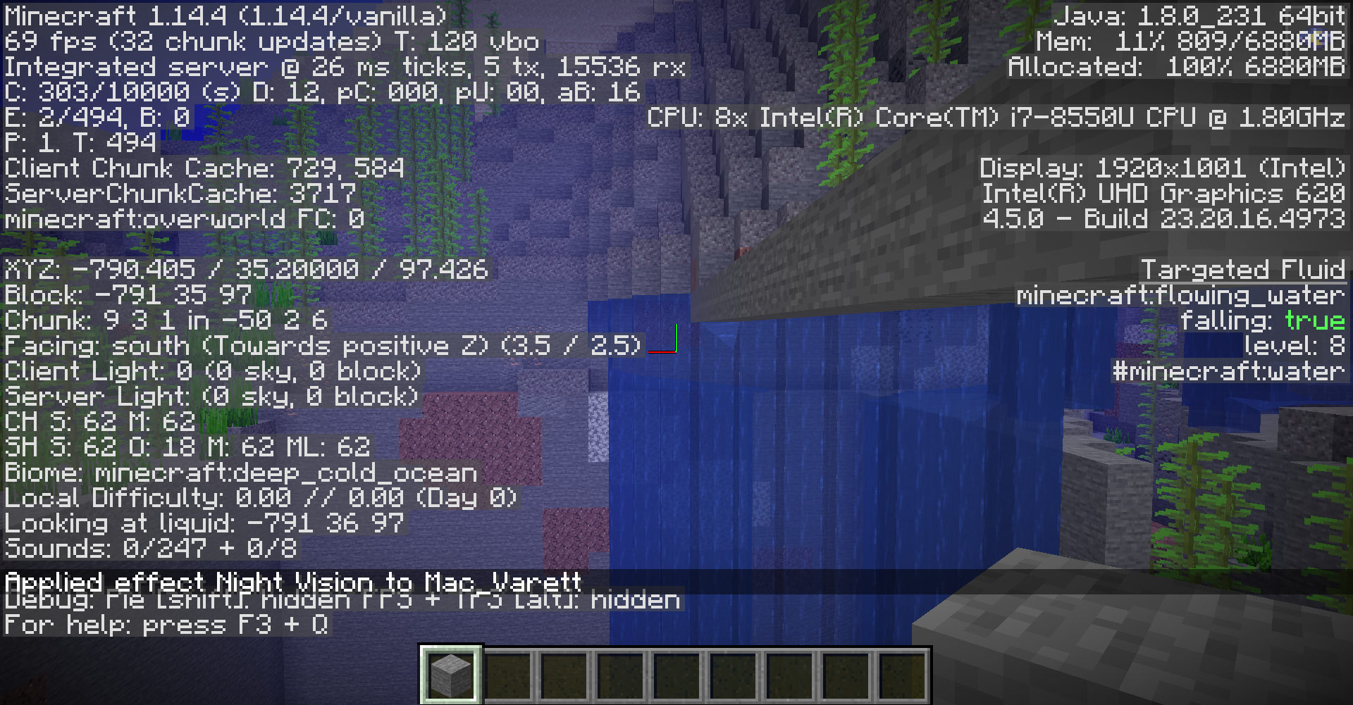What I expected to happen was building under water a tunnel and when I was bellow some blocks that had water above the block and bellow and when you stand bellow the blocks is showed incorectly underwater textures.