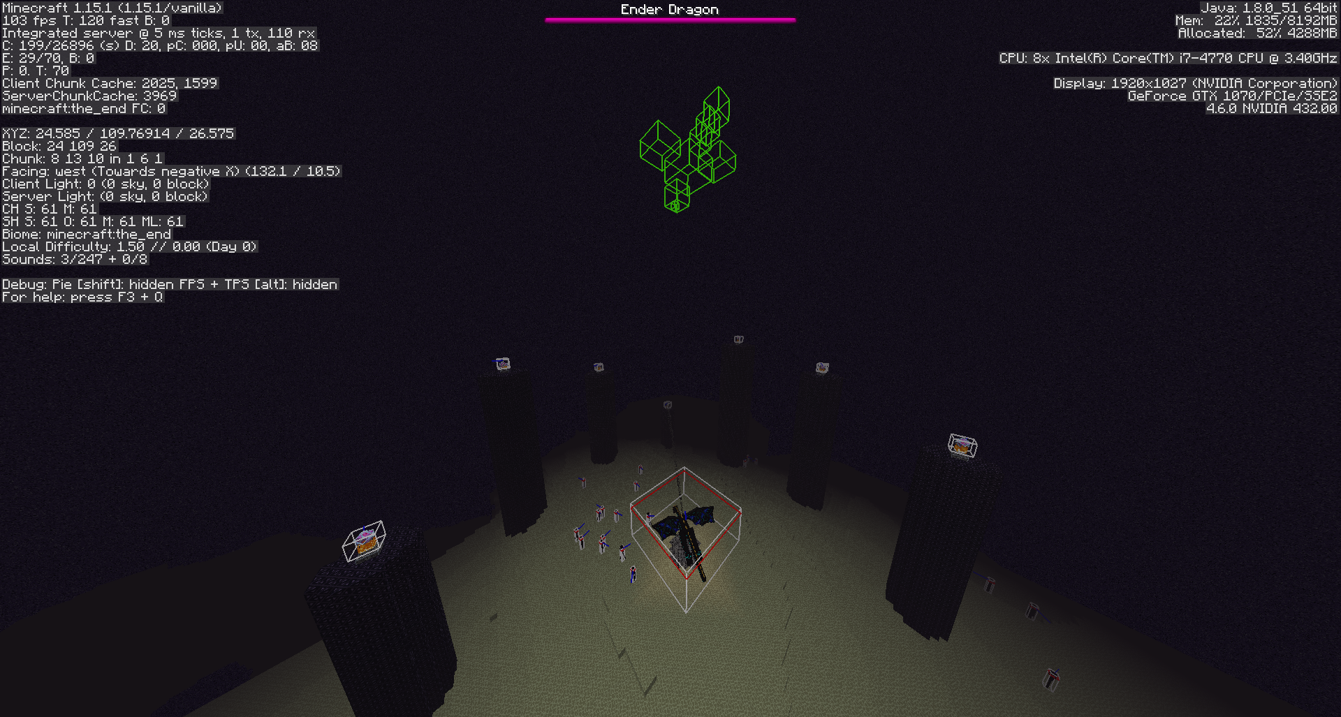 Not sure what's going on here, but i went to the end with hitboxes on, and noticed a bright green set of boxes flying above the Enderdragon, at first i thought there was more than one.