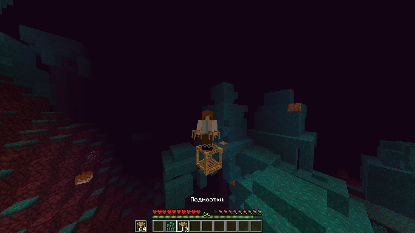 Когда я начал очень быстро ставить подмостки, пока 1 начал падать вних, он успел поставить второй в воздух, и, как я думал, это визуальный баг, и на самом деле он исчезнен, но нет, я смог встать на него, и более того мог ставить подмостки дальше (старый пропадал, а новый появлялся)