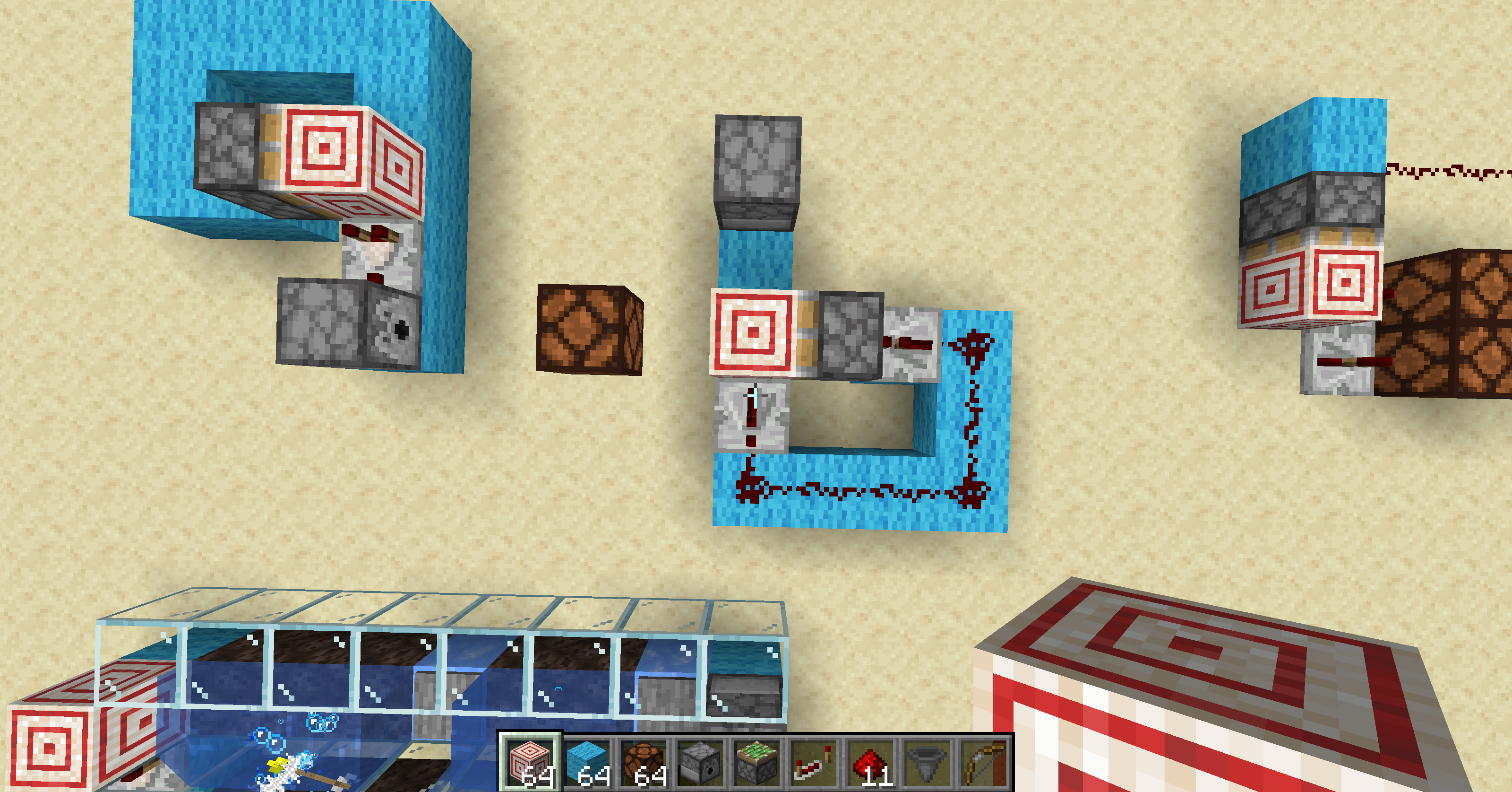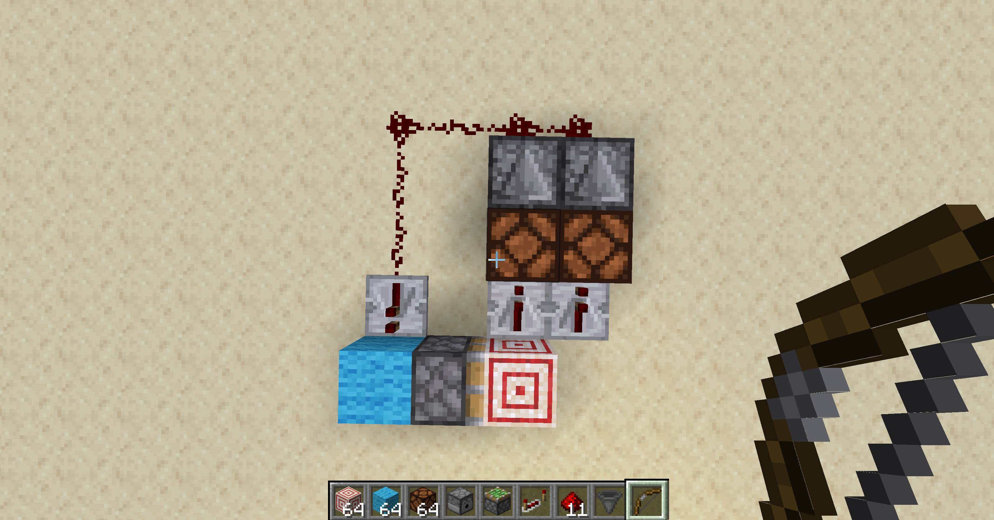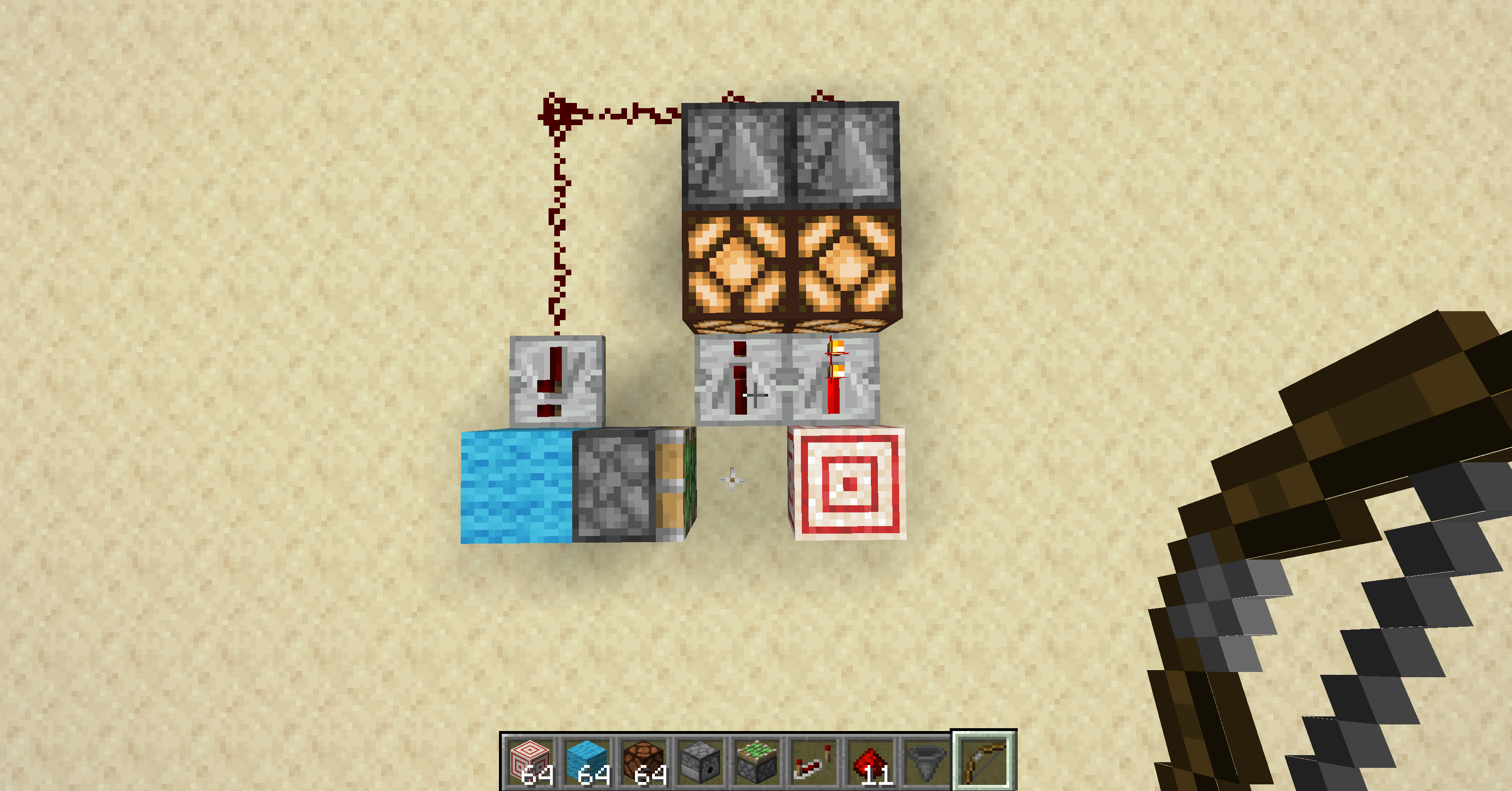 In the three pictures titled "signal_experiment", I have set up two repeaters at the locations where a target block could be when pushed and pulled by a sticky piston. As per the previous naming scheme, the "signal_experiment_layout" is the circuit at rest before any projectiles are fired. "signal_experiment_frozen shows the sticky piston having spit out the target block and the arrow that triggered the piston firing having fallen down to the ground. Despite this, the target block emits a continuous redstone signal which keeps the right repeater powered. This signal state persists so long as the target block is not affected in any way. Firing a projectile at the target block again as shown in "signal_experiment_reset" causes the target block to de power, causing the sticky piston to fire again to retract the target block. Again, I apologize I cannot provide a video myself and I urge any bug fixers to play around with the provided circuit yourself to see specific interactions and redstone timings.