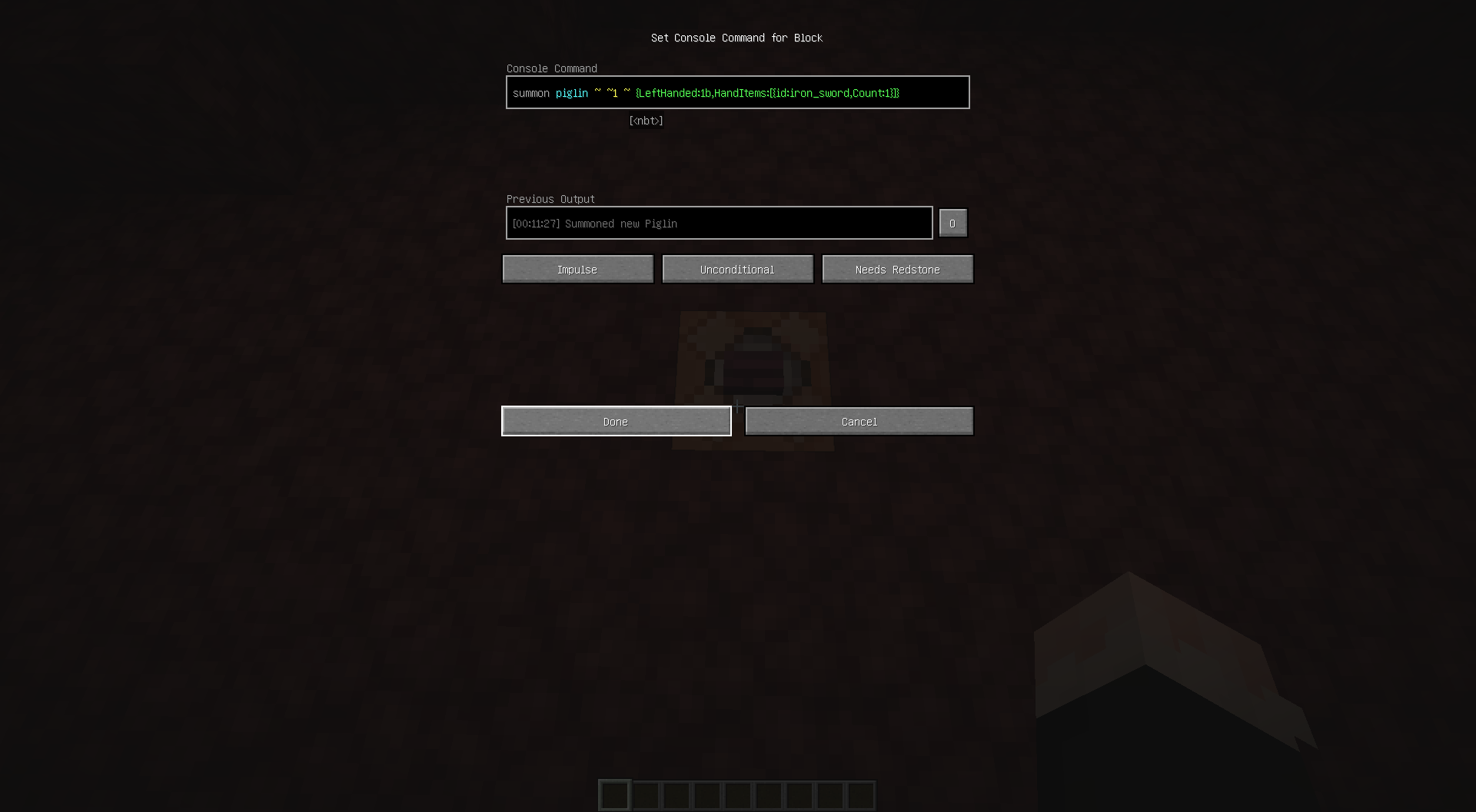 /summon piglin ~ ~ ~ {LeftHanded:1b,HandItems:[{id:iron_sword,Count:1}]}/summon piglin ~ ~ ~ {LeftHanded:1b,HandItems:[{id:iron_sword,Count:1}]}→ ❌ Notice that the piglin is still holding the weapon with it right hand.