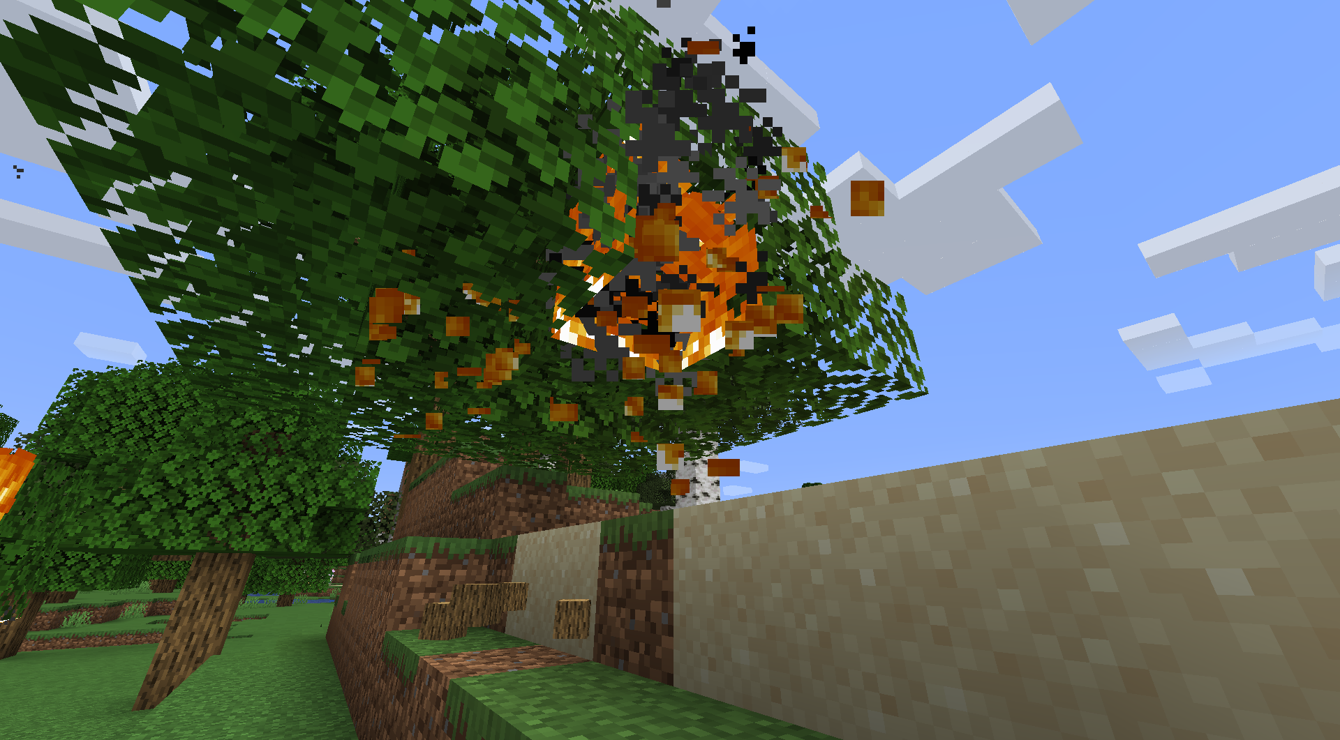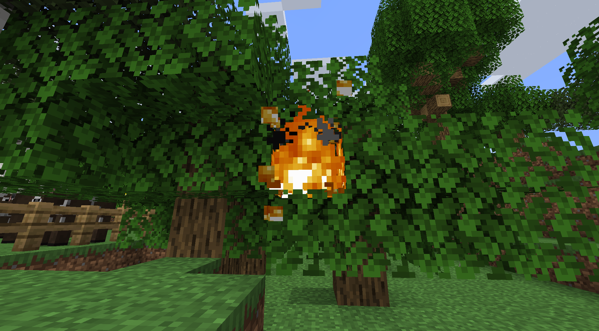 Alternatively, light the leaves of a tree and watch for the particles as the blocks burn up, though sometimes this glitch doesn't seem to occur using this method and some leaves burn as normal. Additionally, extinguishing fire using a bucket of water also doesn't cause this glitch to happen.