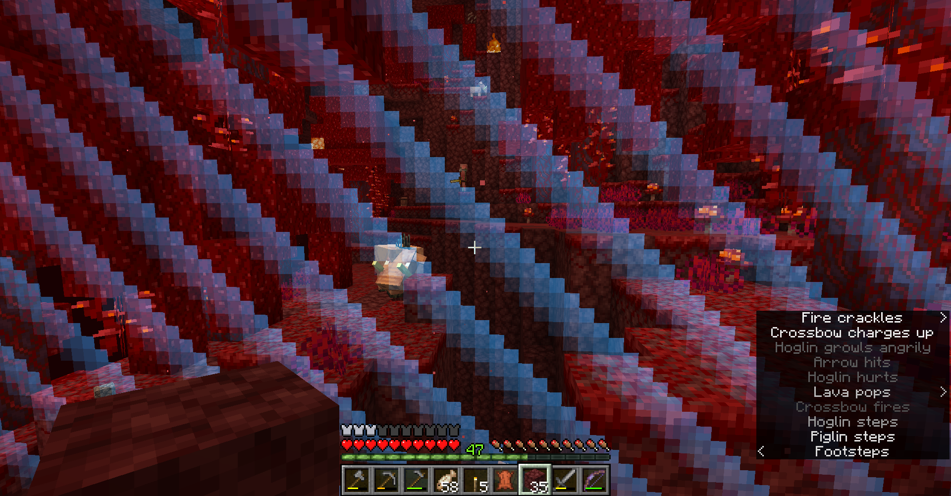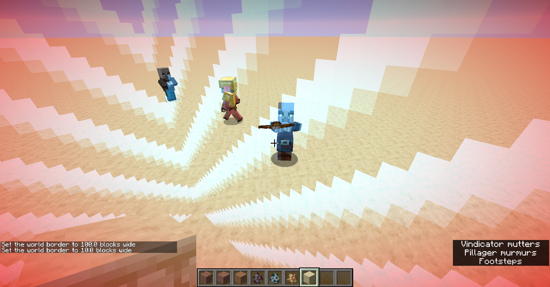 Held items (i.e. pillager crossbows and piglin swords) render in front of the wold border, but the mob holding them does not. This does not seem to apply to armor.