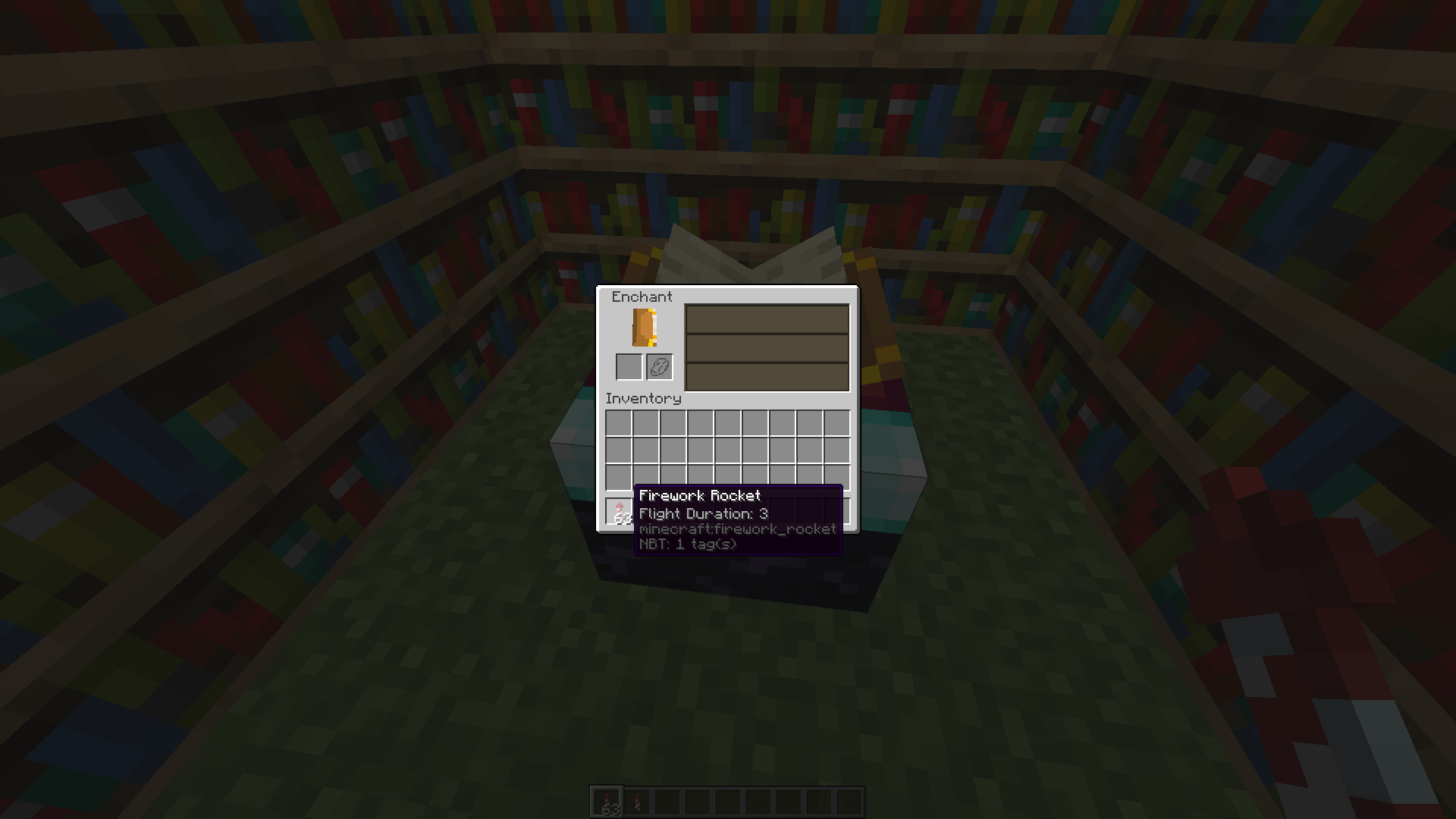 When you put a firework rocket in an enchanting table with a flight duration level or an NBT tag the game forgets it and the rocket is no longer stackable with the rest and resets to flight duration 1 (this only happens when shift clicking, dragging it in the place doesnt make it lose its nbt data)