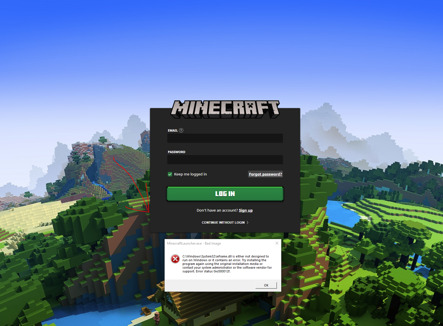 I was trying to connect to a minecraft server, the screen starting bilnking the message logging in and loading terrain repeatedly so I restarted my game and it wont let me login and i tried resetting my password, it just gives me some "bad image" error