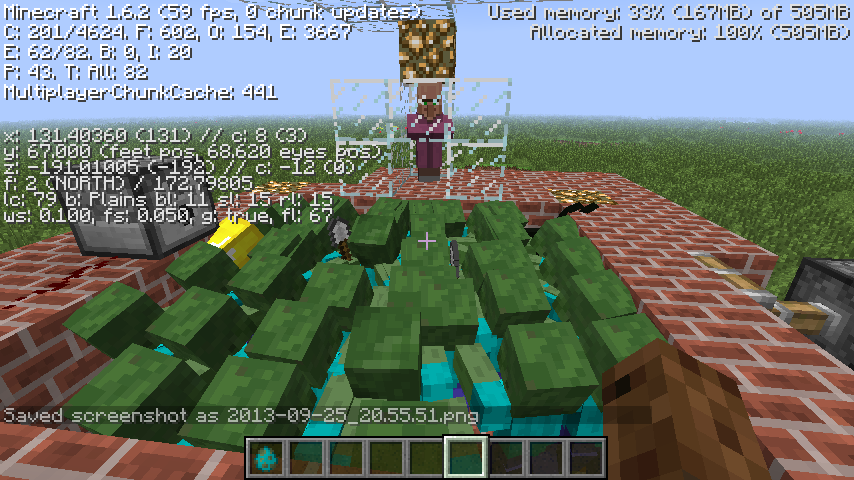Vec3 Pool Size: 1743 (97608 bytes; 0 MB) allocated, 10 (560 bytes; 0 MB) usedNote that I did upgrade to 13w24a. During testing, just before I did the crash report, a small Zombie Siege was occuring with only a few zombies. When I originally reported this issue there tended to be 10-20 zombies on Easy, so that seems to have changed with the new update. That said, the lag is still occuring even with only a few zombies.