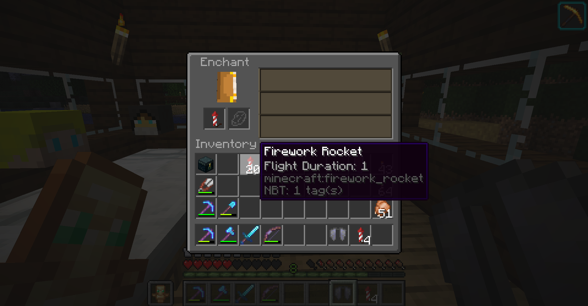 When putting a firework rocket in the enchantment table slot (only shift), and than shifting it out aigan it loses it "Flight Duration: 1" tag.